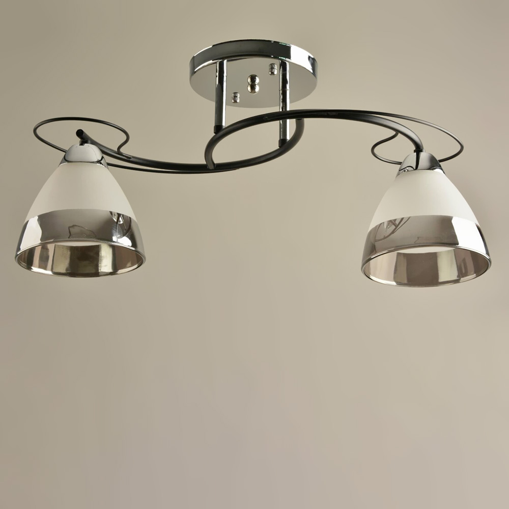 Люстра стельова на дві лампи зі скляними плафонами, які створюють приємну атмосферу, має стильний та сучасний дизайн, що надає шарму та елегантності вашому простору. Вона підходить для різних інтер'єрів, чи то сучасний, класичний чи інший стиль.