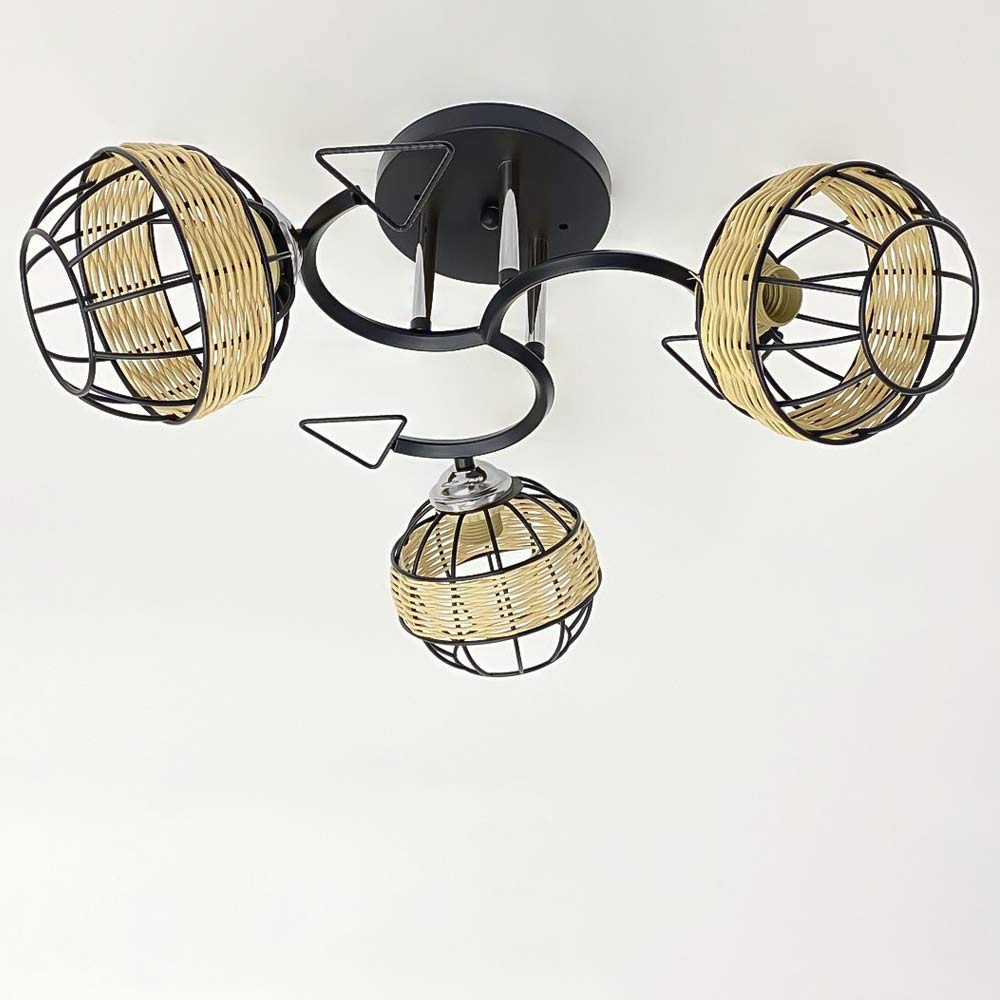Стельова люстра в стилі Лофт на три лампи з плафонами сферичної форми. Металеві плафони виконані у вигляді округлої клітини та прикрашені декоративним плетінням: що забезпечує цікаву гру світла та тіні при включеному джерелі світла. Найкраще підійде у приміщенні загальною площею 9 м² при використанні ламп 6 Вт (LED) або 60 Вт (стандартна).