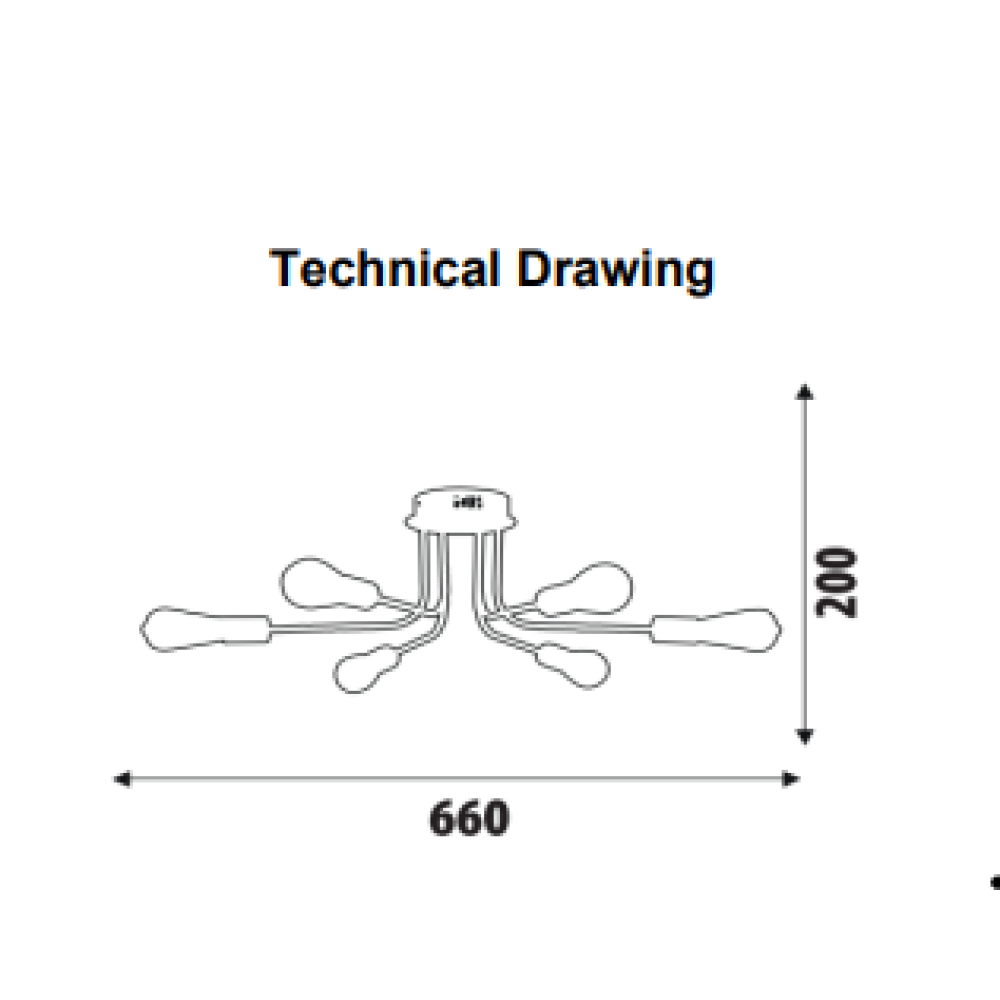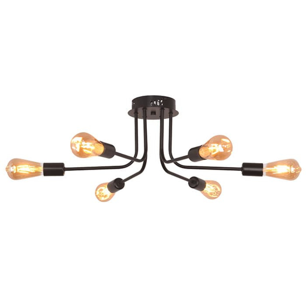 Стельова люстра в стилі Лофт на шість ламп без плафонів. Найкраще ця люстра підійде для освітлення 18 м² приміщення, при використанні лампочок 6 Вт (LED) або 40 Вт (стандартна), буде актуальна для приміщень з невисокими стелями.