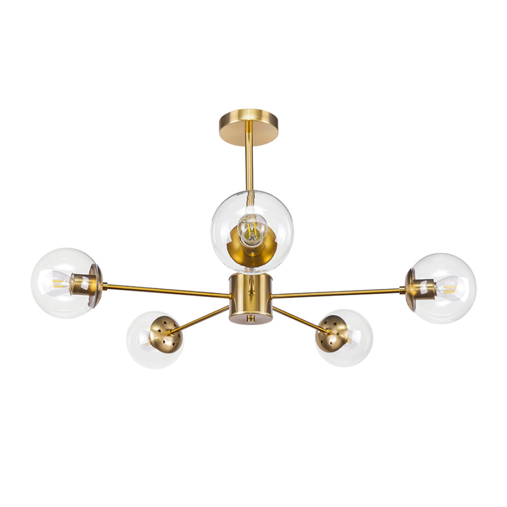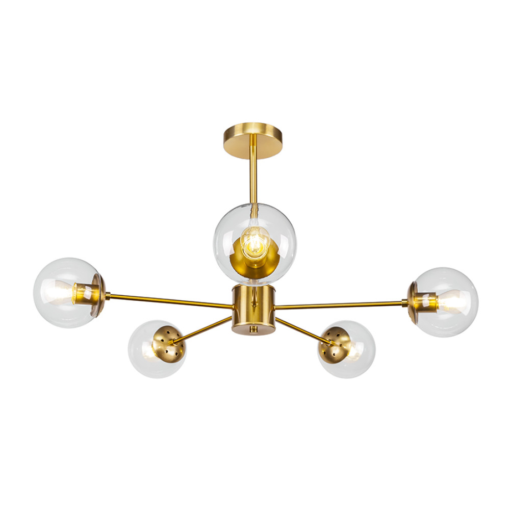 Декоративні стельова люстра молекули в сучасному стилі на п'ять ламп з плафонами сферичної форми.