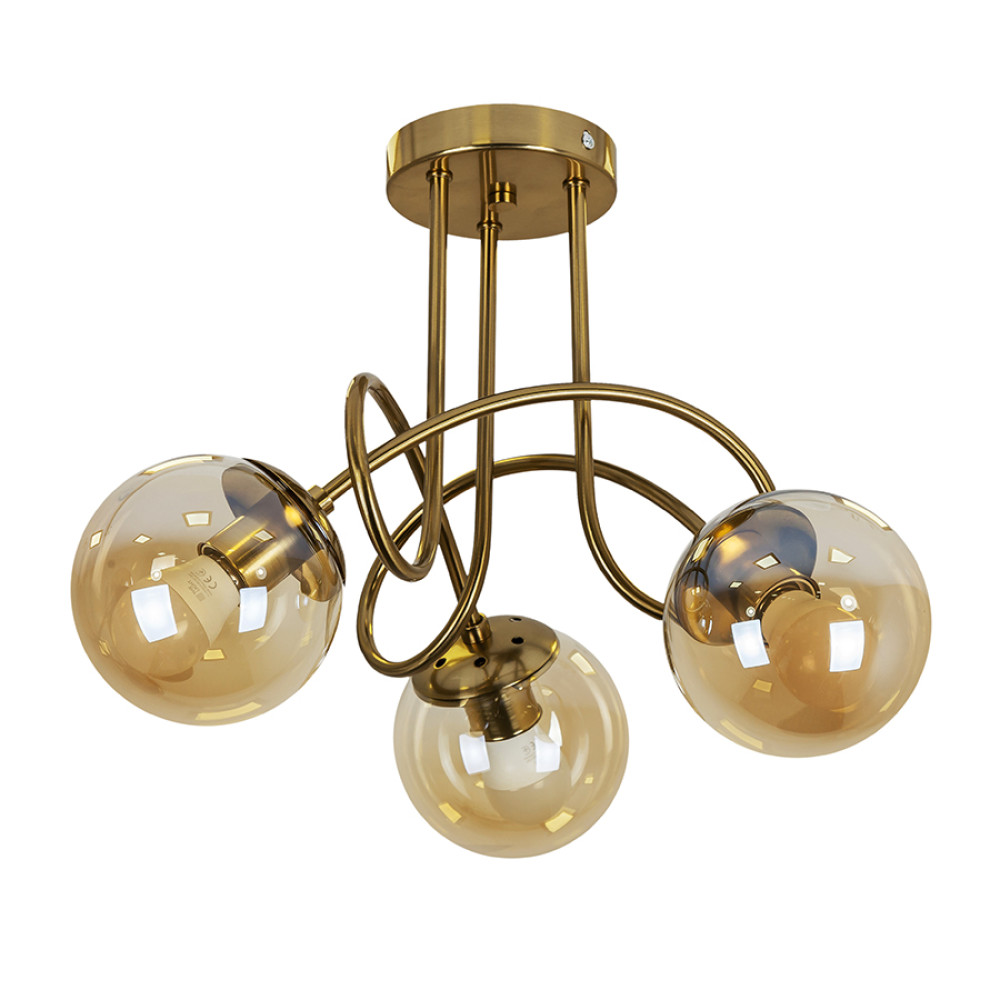 Сучасна стельова люстра-молекула на три лампи зі скляними плафонами.