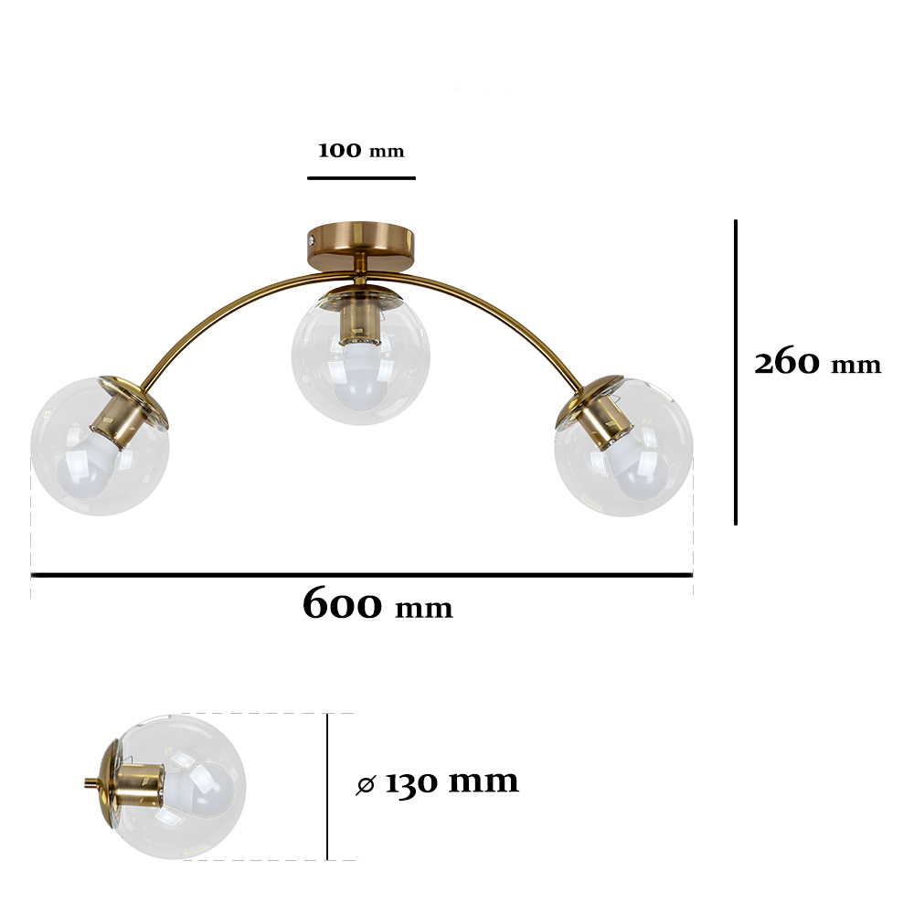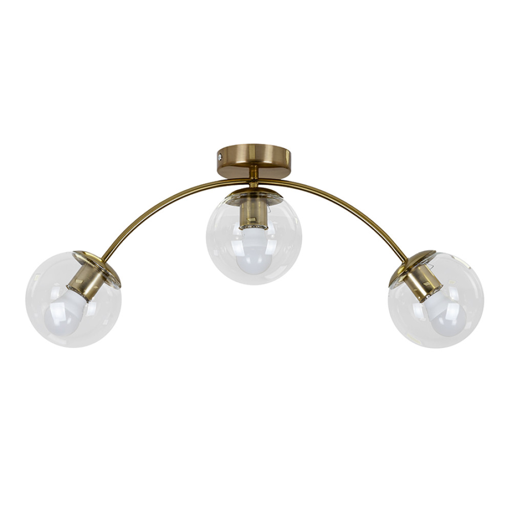 Сучасна стельова люстра-молекула на три лампи зі скляними плафонами.