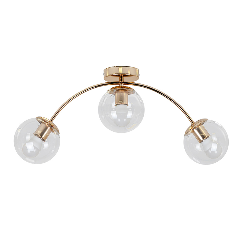 Сучасна стельова люстра-молекула на три лампи зі скляними плафонами.