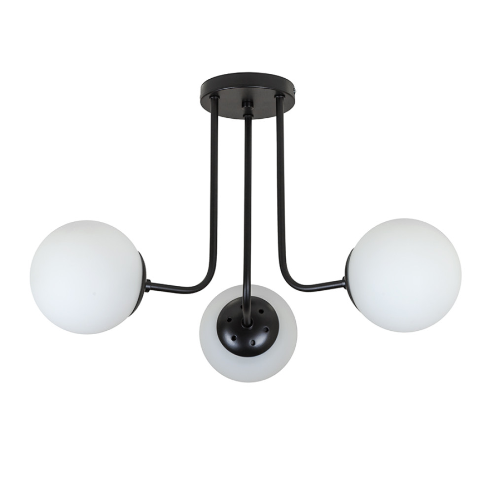 Сучасна стельова люстра-молекула на три лампи зі скляними плафонами.