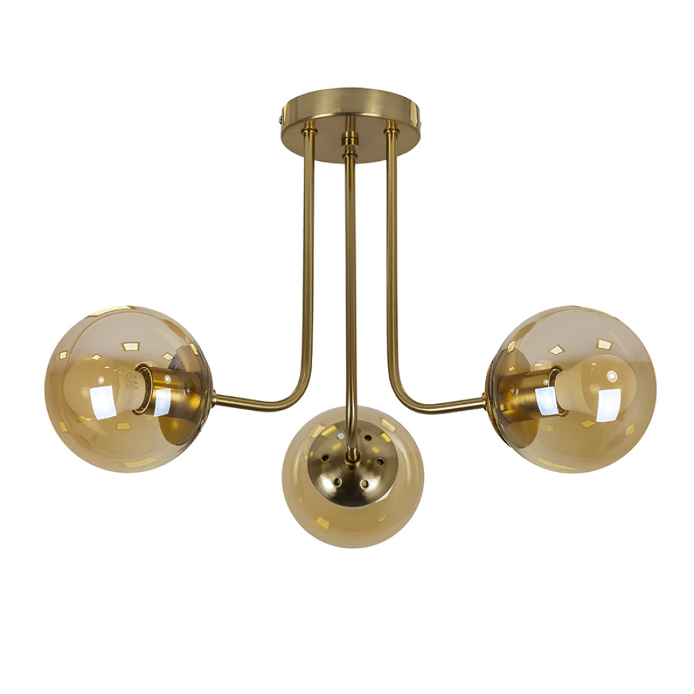 Сучасна стельова люстра-молекула на три лампи зі скляними круглими плафонами.
