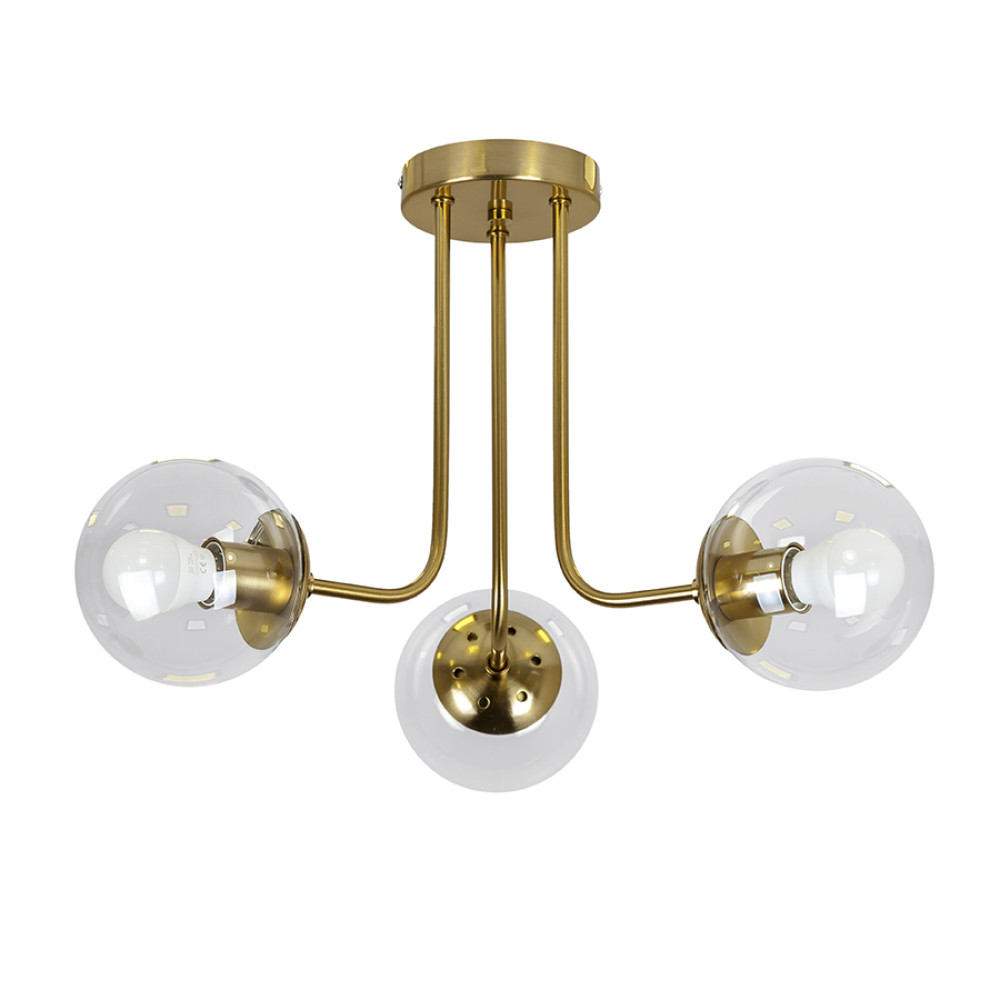 Сучасна стельова люстра-молекула на три лампи зі скляними плафонами.