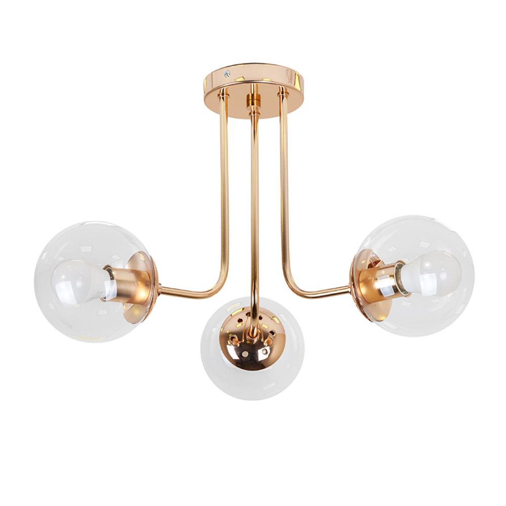 Сучасна стельова люстра-молекула на три лампи зі скляними круглими плафонами.