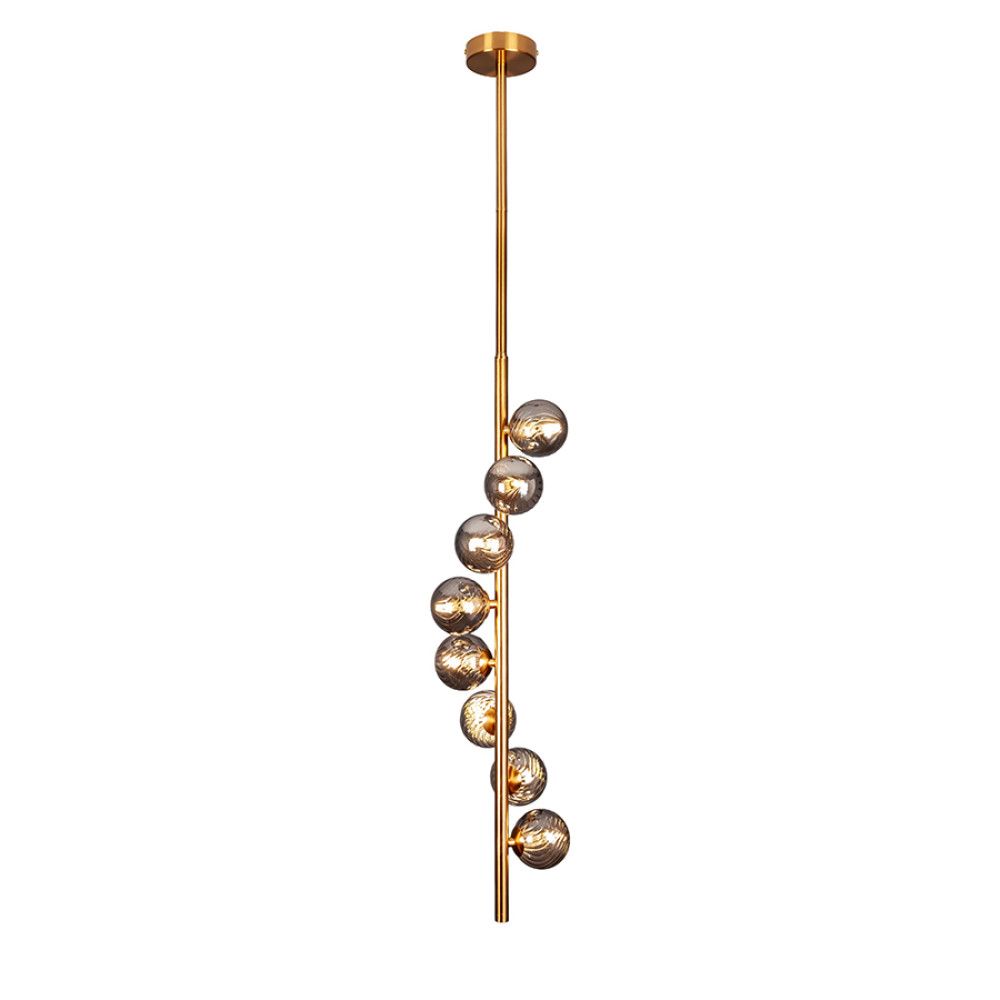 Сучасна стельова люстра-молекула на вісім ламп зі скляними плафонами-кулями на довгому вертикальному металевому корпусі буде актуальна для високих стель.