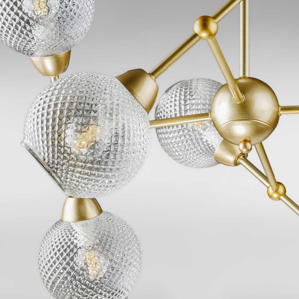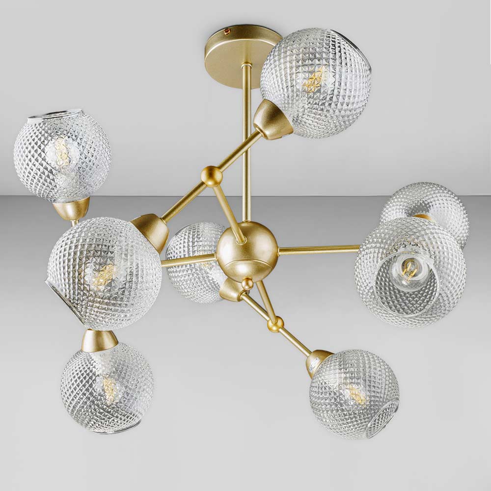 Стельова люстра-молекула на вісім ламп у сучасному стилі зі скляними¦рифленими плафонами сферичної форми.