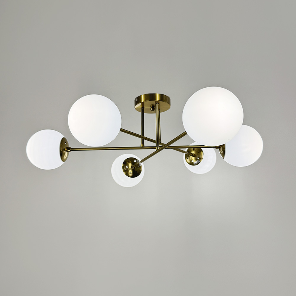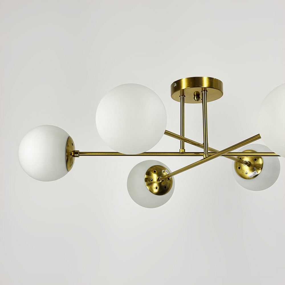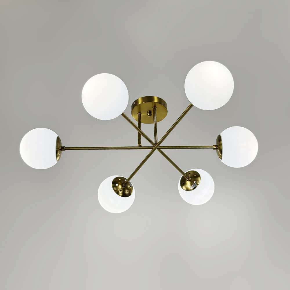 Стельова люстра в металевому латунному корпусі, оснащена 6 білими плафонами, кожен діаметром 12 см. Плафони виготовлені зі скла, мають круглу форму, вони надають люстру сучасний і стильний вигляд. Цоколь Е27 робить люстру зручною у використанні. Висота люстри складає 25 см, а діаметр – 73 см.