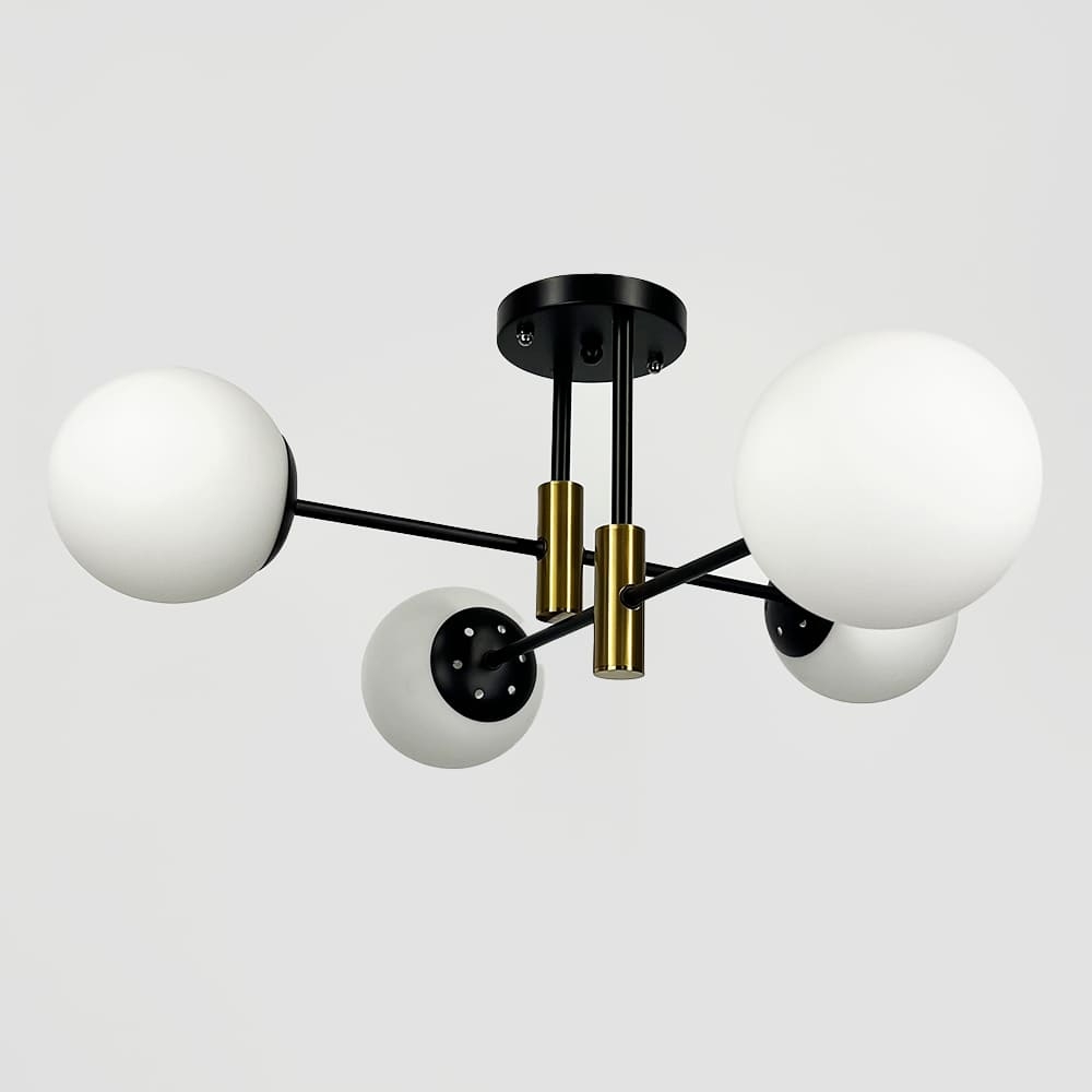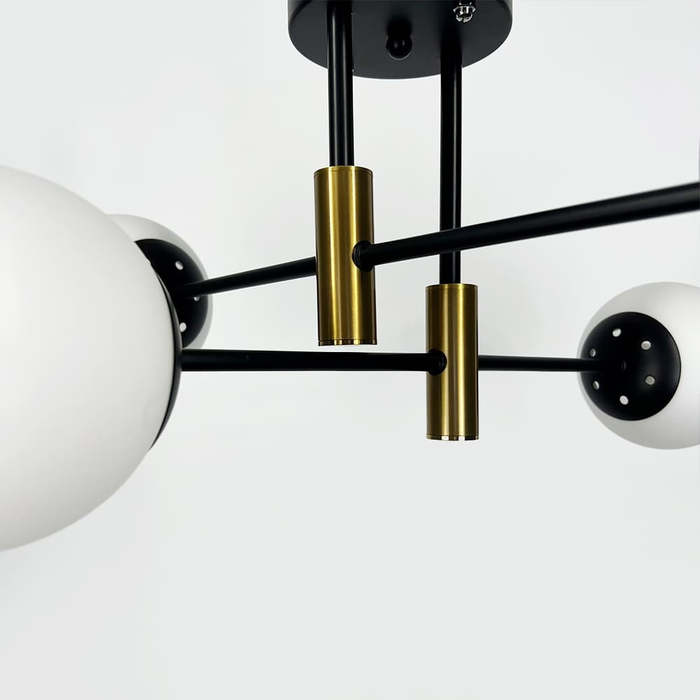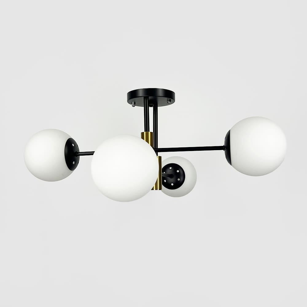 Сучасна стельова люстра-молекула на чотири лампи. Металевий корпус люстри включає в себе конструкцію з довгих прутків, на обох кінцях яких розташовані скляні плафони-кулі, з декоративними циліндрами латунного кольору в центральній частині люстри.