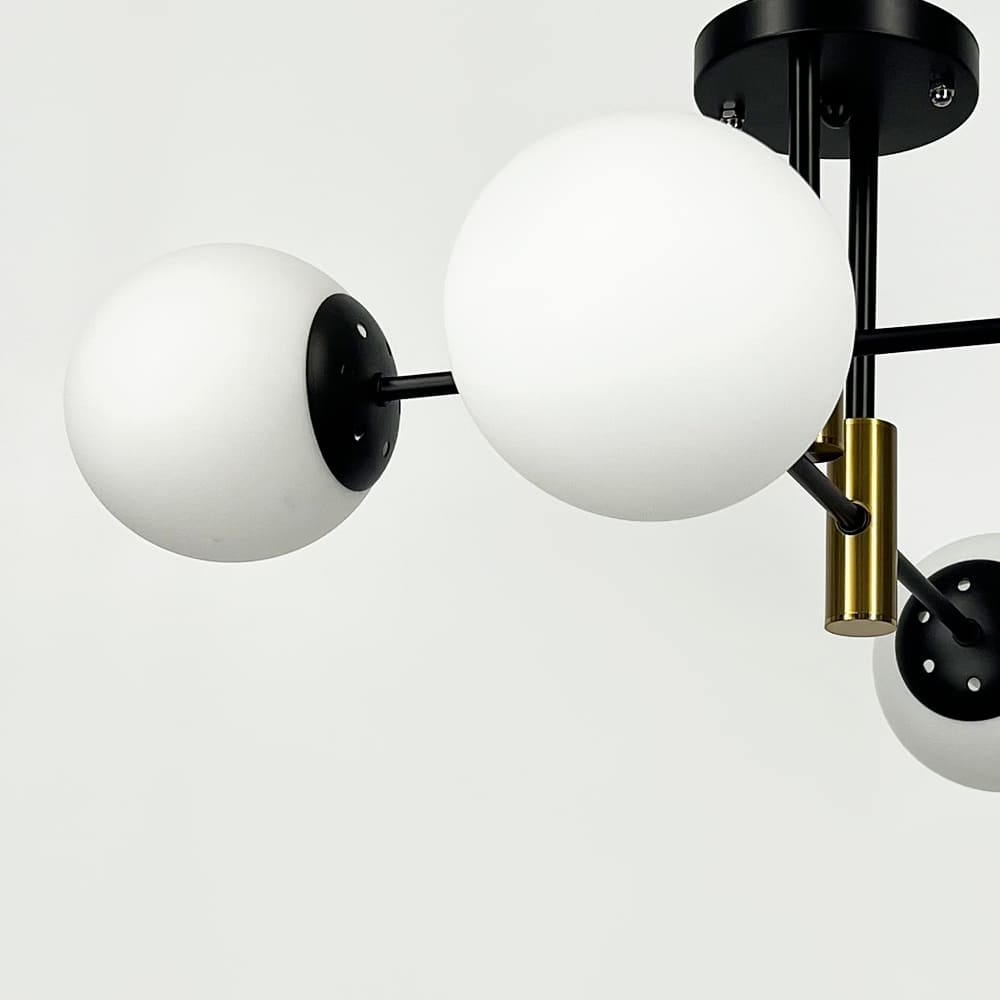 Сучасна модель стельової люстри в чорному металевому корпусі з білими скляними плафонами і латунною фурнітурою представлена в 3-х комплектаціях: на 4 плафони: діаметр люстри - 55 см, висота (відступ від стелі) - 25 см на 6 см на 5 плафонів: люстри – 80 см, висота (відступ від стелі) – 30 см. Люстри оснащені цоколем E27, що дозволяє використовувати лампи різної потужності та типу.