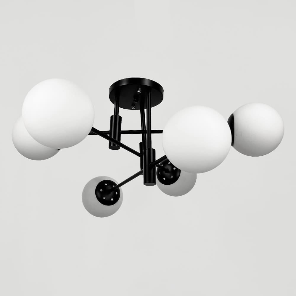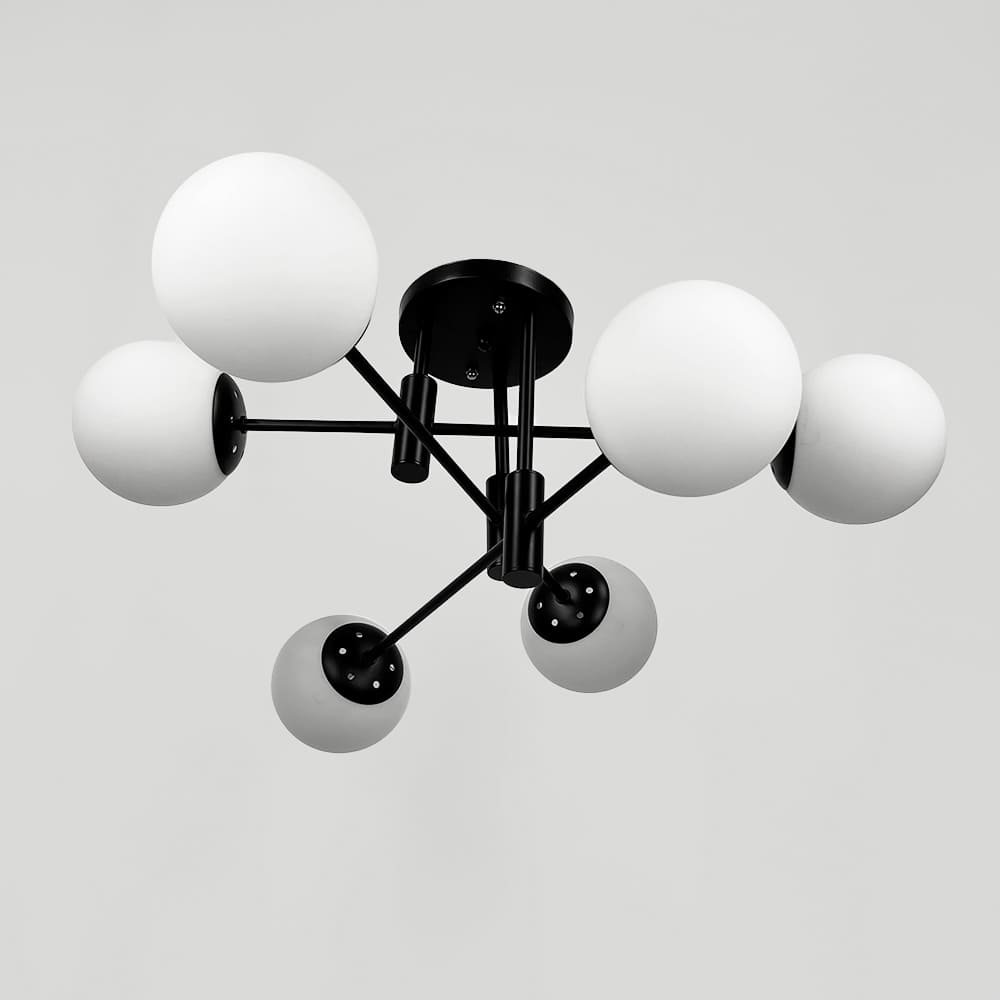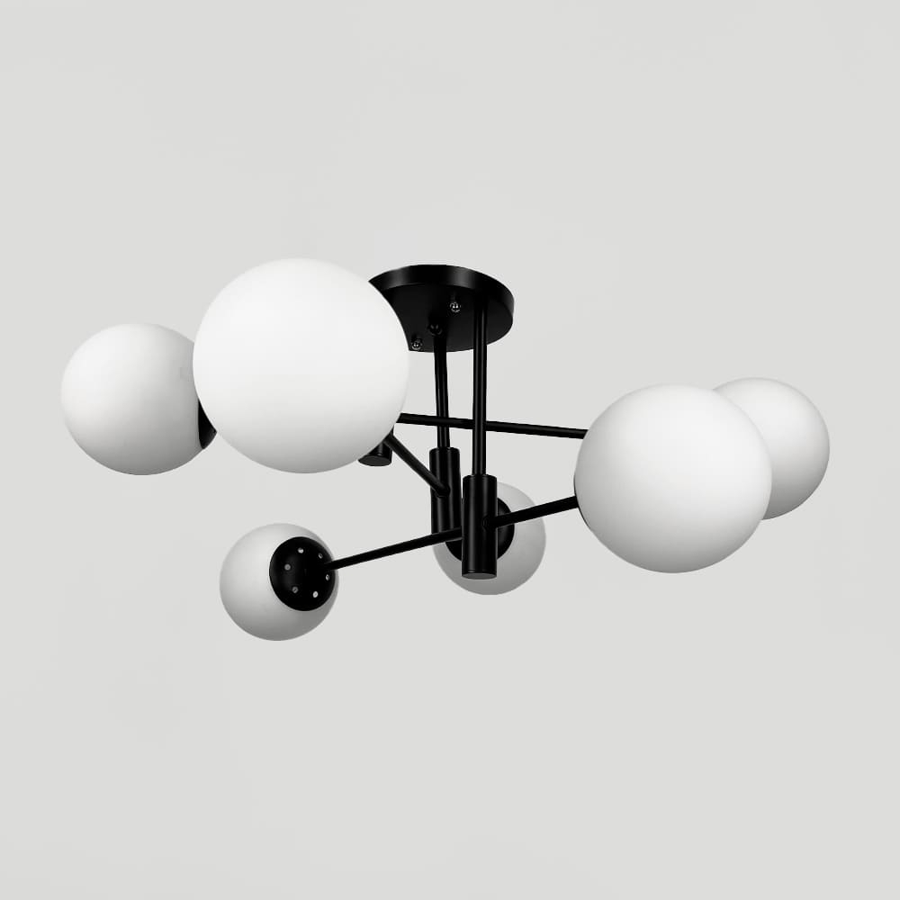 Сучасна стельова люстра-молекула на шість ламп. Металевий корпус люстри включає в себе конструкцію з довгих прутків, на обох кінцях яких розташовані скляні плафони-кулі, з декоративними циліндрами в центральній частині люстри. Найкраще ця люстра підійде для приміщень із загальною площею 18 м², при використанні лампочок 6 Вт (LED) або 60 Вт (стандартна), добре підійде для невисоких стель.