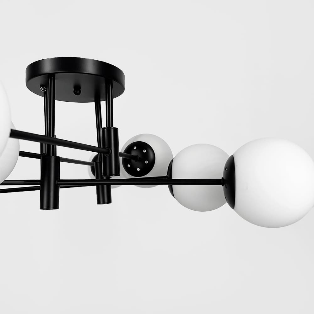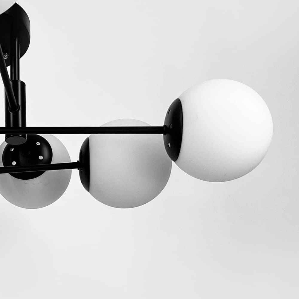 Сучасна стельова люстра-молекула на вісім ламп. Металевий корпус люстри включає в себе конструкцію з довгих прутків, на обох кінцях яких розташовані скляні плафони-кулі, з декоративними циліндрами в центральній частині люстри. Найкраще ця люстра підійде для приміщень із загальною площею 24 м², при використанні лампочок 6 Вт (LED) або 60 Вт (стандартна), добре підійде для невисоких стель.