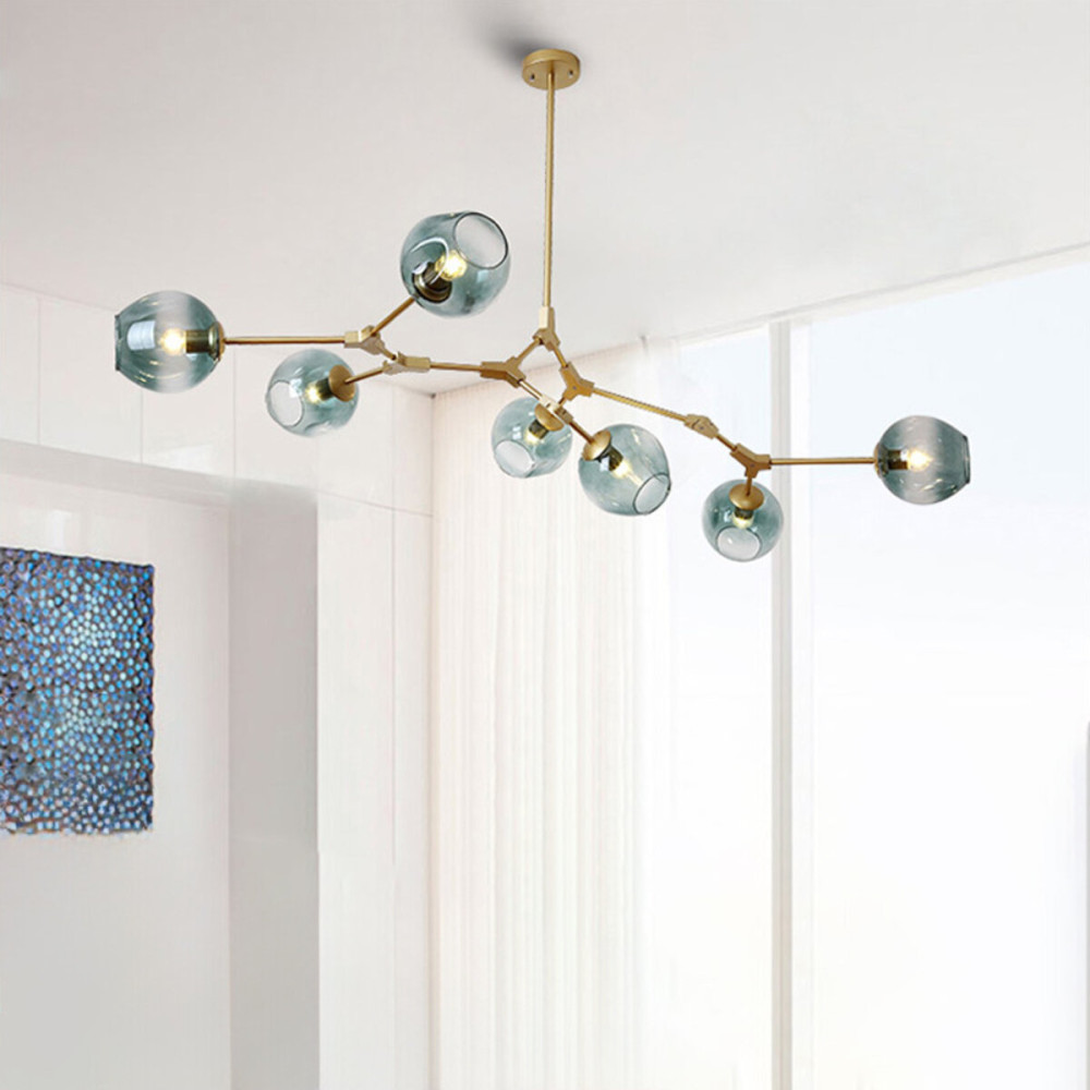 Стильна стельова люстра-молекула на сім ламп із фігурними скляними плафонами.