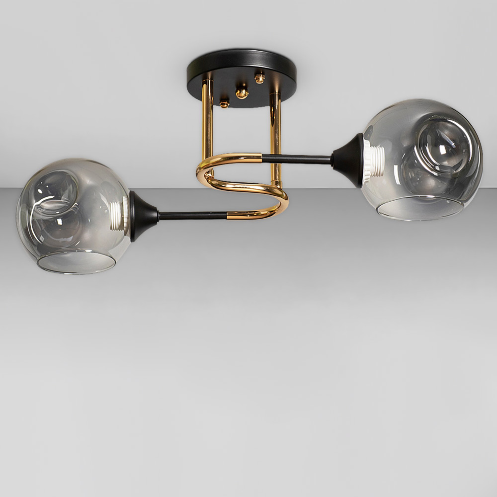 Стильна стельова люстра на дві лампи зі скляними декоративними плафонами круглої форми.