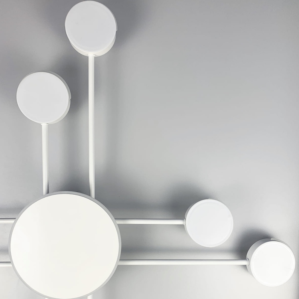 Стельова дизайнерська світлодіодна люстра в білому корпусі на вісім круглих плоских плафонів, без пульта керування.