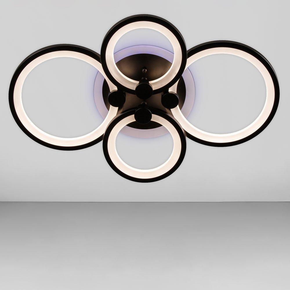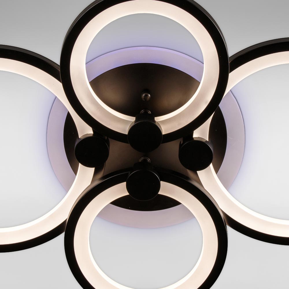 Стельова світлодіодна люстра в сучасному стилі, на чотири джерела світла у вигляді LED кілець з диммером та RGB з підсвічуванням корпусу.
