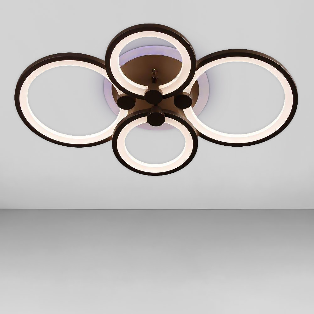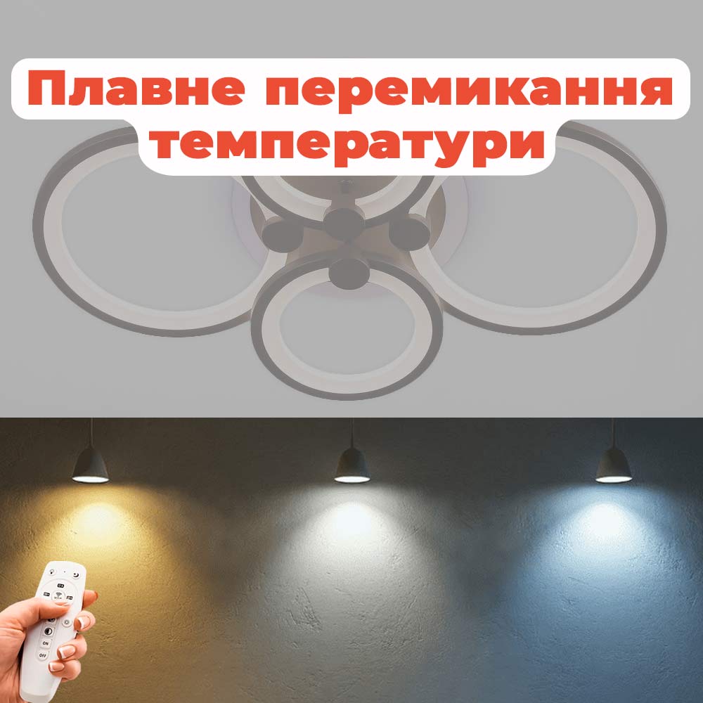 Стельова світлодіодна люстра в сучасному стилі, на чотири джерела світла у вигляді LED кілець з диммером та RGB з підсвічуванням корпусу.