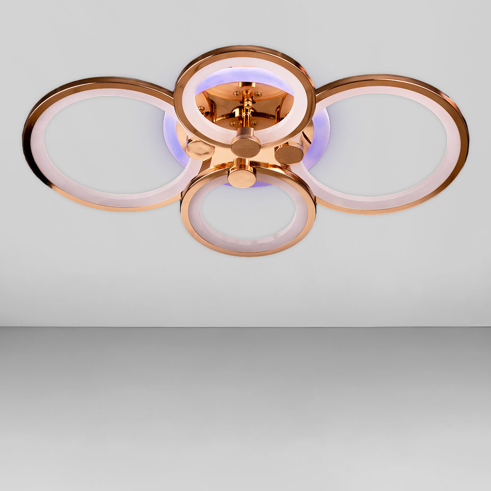 Стельова світлодіодна люстра в сучасному стилі, на чотири джерела світла у вигляді LED кілець з диммером та RGB з підсвічуванням корпусу.