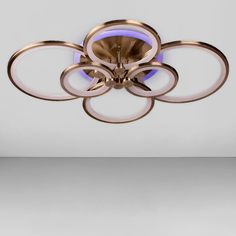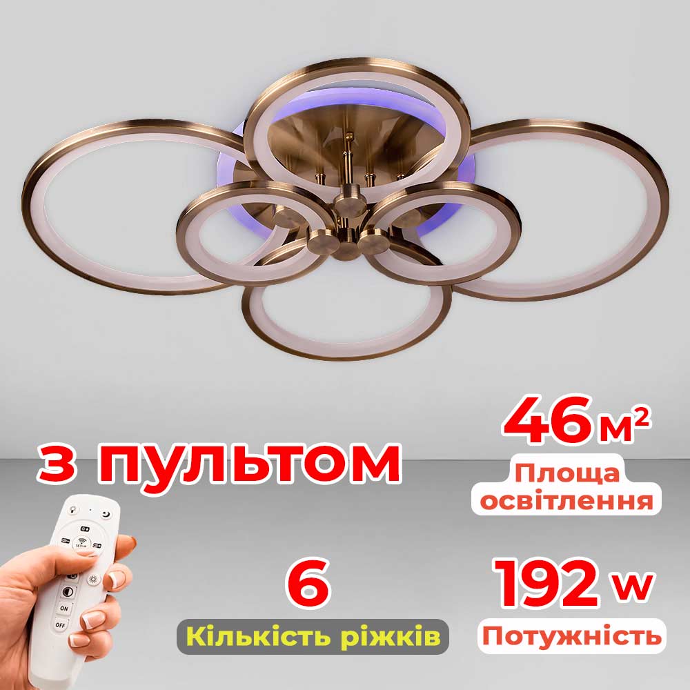 Стельова світлодіодна люстра у сучасному стилі, на шість джерел світла у вигляді LED кілець з диммером та RGB з підсвічуванням корпусу.