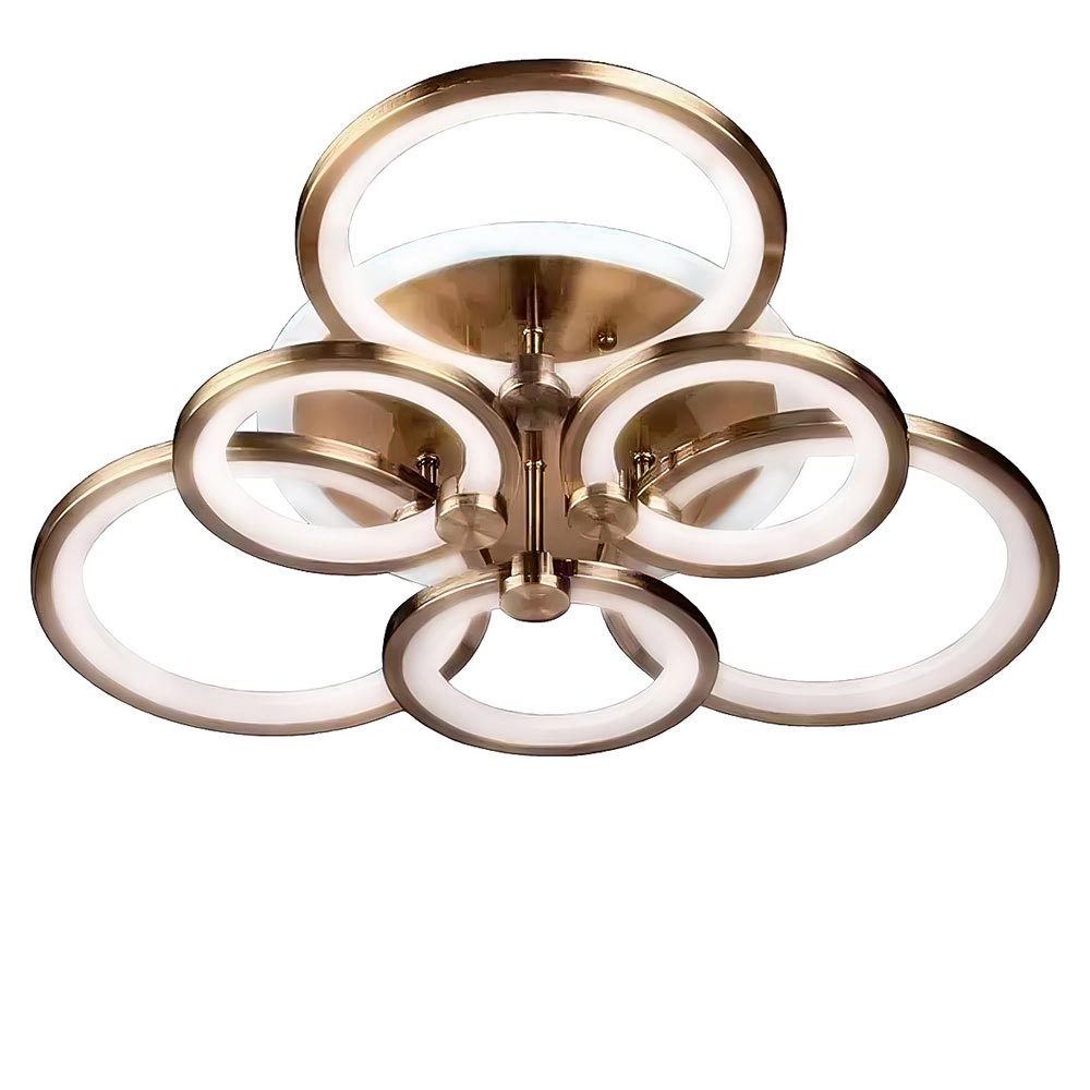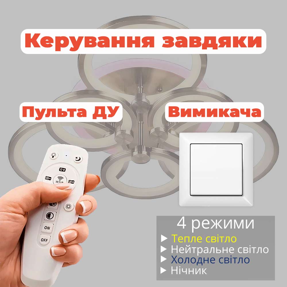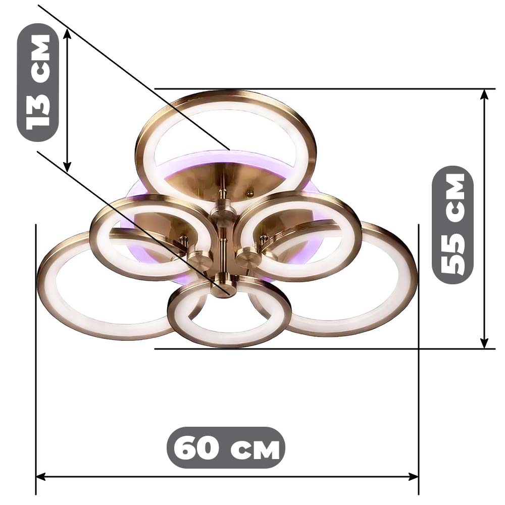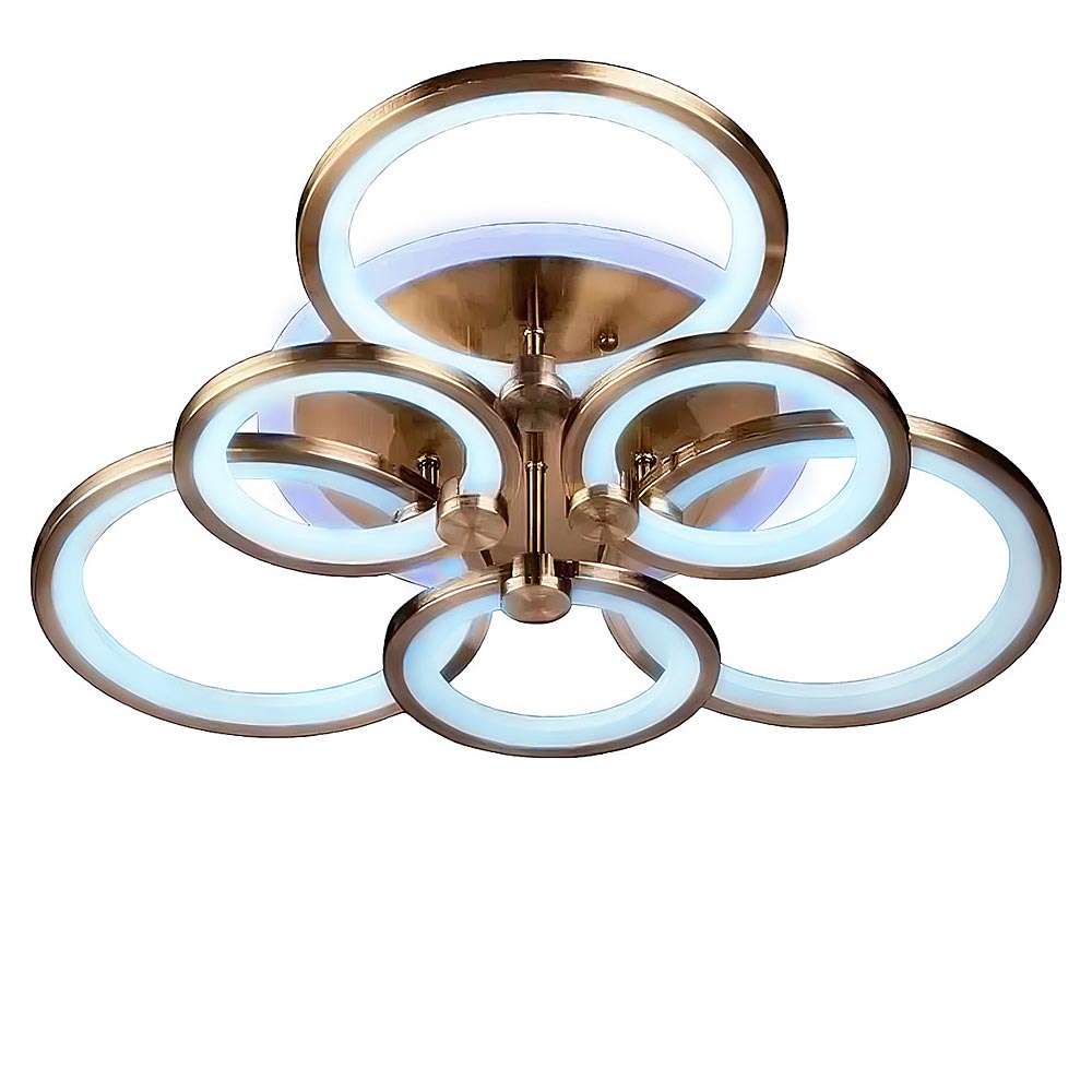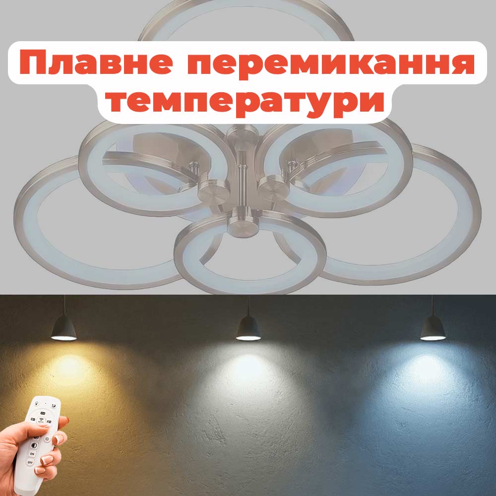 Стельова світлодіодна люстра в сучасному стилі, на шість джерел світла у вигляді LED кілець з RGB підсвічуванням корпусу, пультом управління, димером і регулюванням температури свічення.