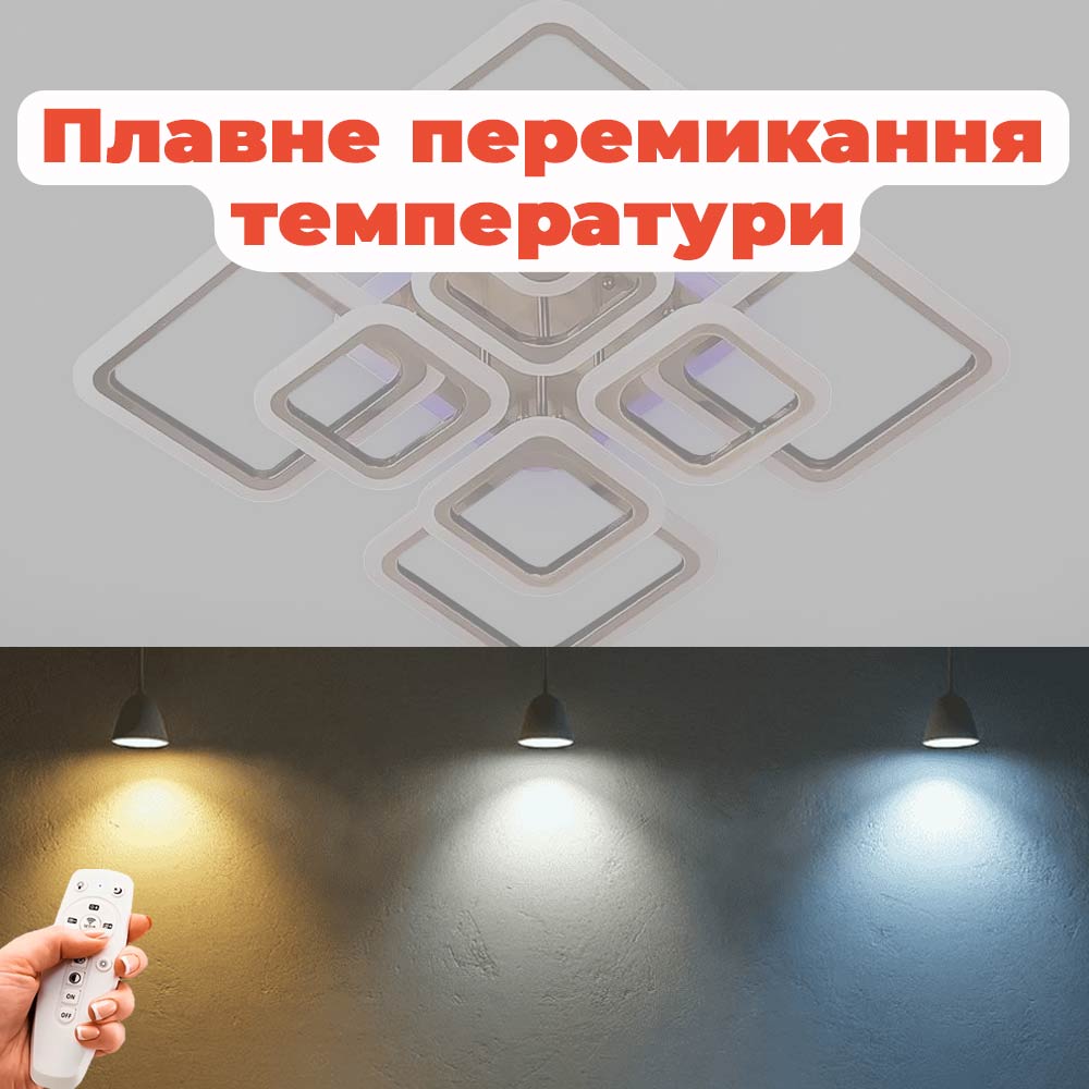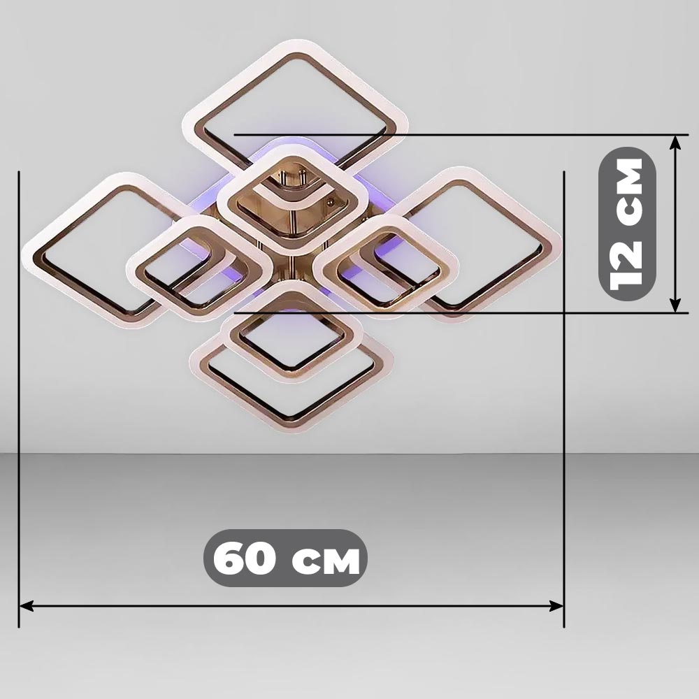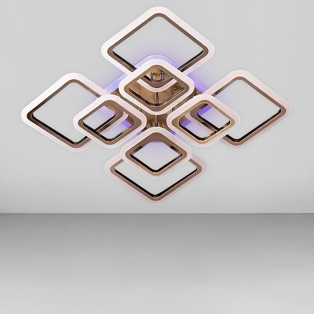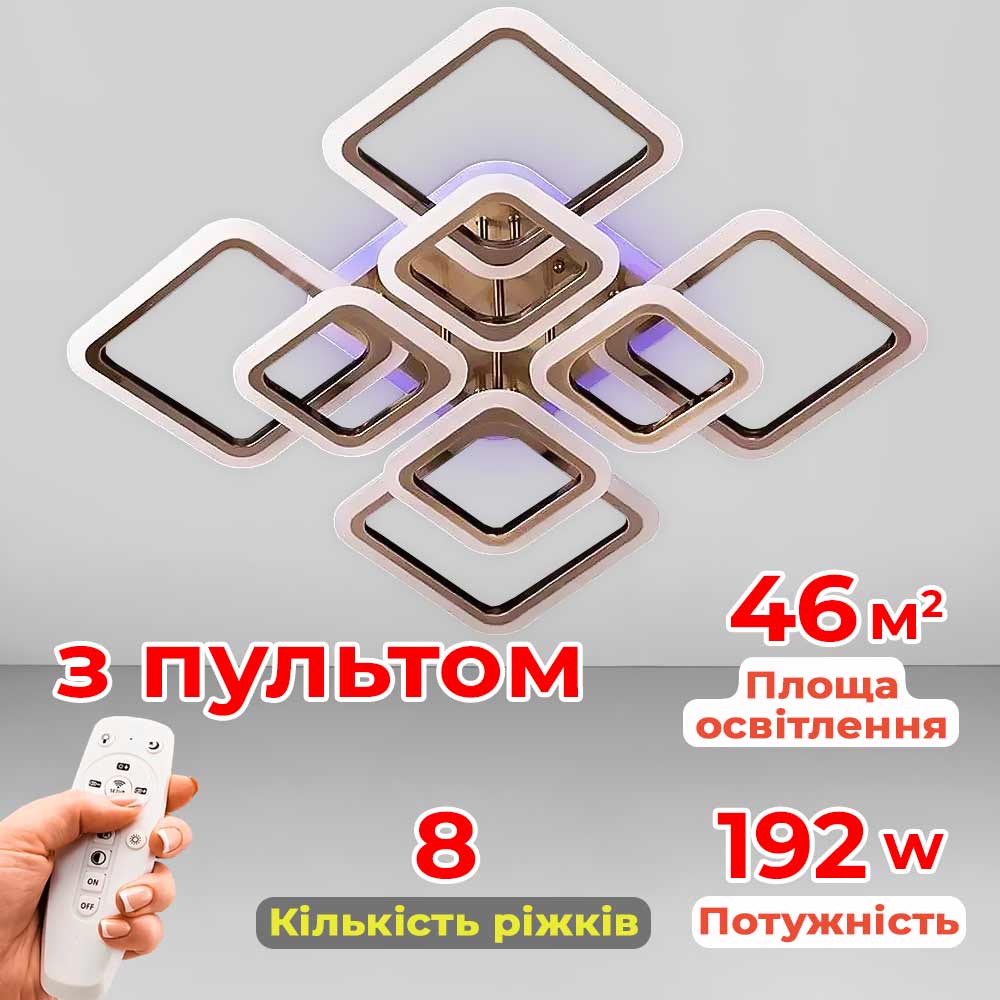 Стельова світлодіодна люстра в сучасному стилі, на вісім джерел світла у вигляді LED квадратів з RGB підсвічуванням корпусу, пультом управління, димером і регулюванням температури свічення.
