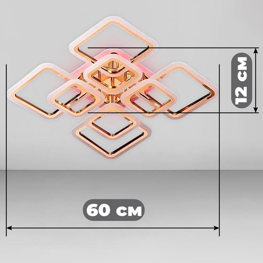Стельова світлодіодна люстра в сучасному стилі, на вісім джерел світла у вигляді LED квадратів з RGB підсвічуванням корпусу, пультом управління, димером і регулюванням температури свічення.