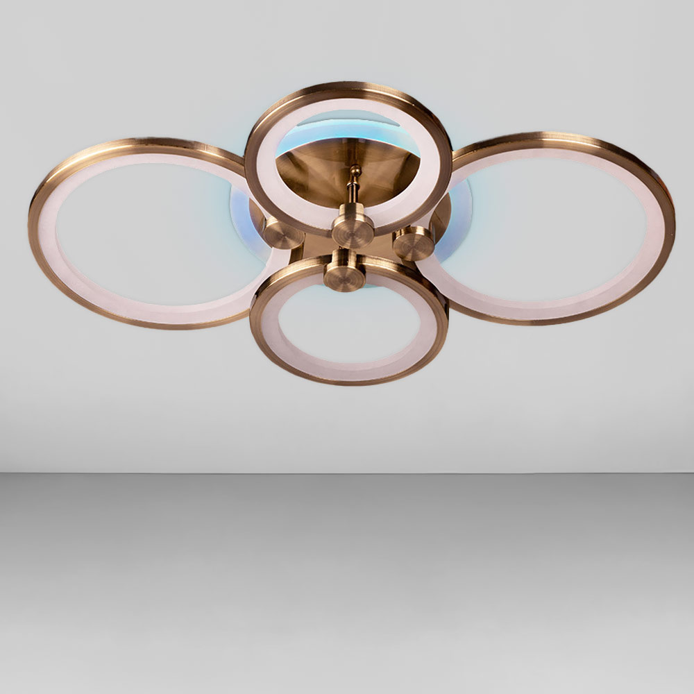 Люстра складається з чотирьох плафонів у вигляді LED кілець, що надають сучасності та елегантності у дизайні. Ця конструкція розсіює світло рівномірно та м'яко, забезпечуючи комфортне та затишне освітлення у приміщенні.