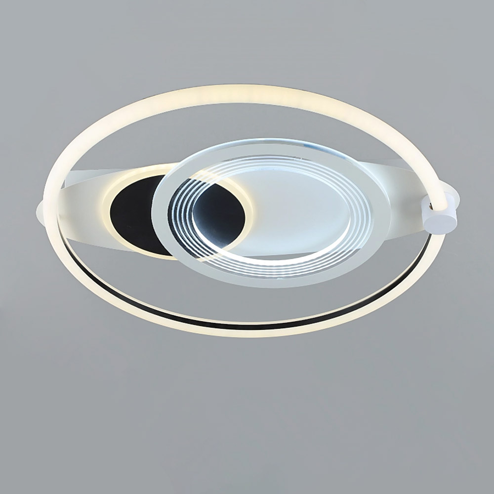 Усередині цієї кільцевої люстри розташовані ще два кільця – одне чорного кольору, а інше білого. Це надає контрасту та грації до дизайну, створюючи цікавий ефект світла та тіней. Чорне кільце може створювати акценти та додавати глибину, тоді як біле кільце м'якше і розсіює світло по всій площі.