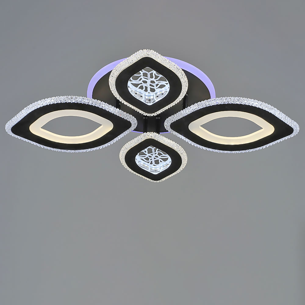 Стельова світлодіодна люстра в сучасному стилі, на чотири джерела світла, з RGB підсвічуванням корпусу та регулюванням температури свічення. Люстра оснащена пультом керування.