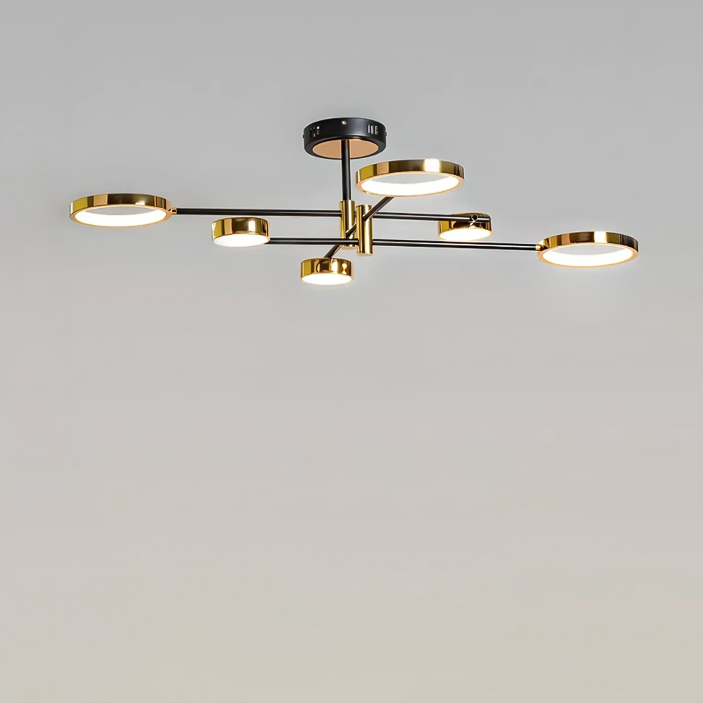 Стельова світлодіодна люстра в сучасному стилі, на шість джерел світла у вигляді LED кілець і плоских кіл, з підсвічуванням корпусу, оснащена пультом управління з функцією регулювання яскравості та температури світла.