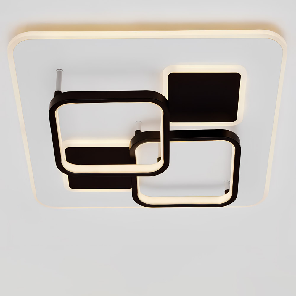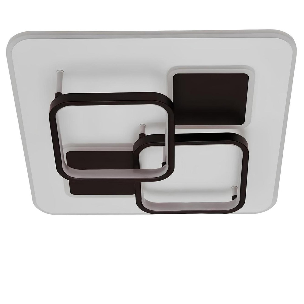 Стельова світлодіодна люстра з плоским квадратним корпусом, який оснащений підсвічуванням. На корпусі люстра має чотири джерела світла, з яких: два у вигляді квадратних кілець, два інші у вигляді чорних квадратів з підсвічуванням. Пульт керування у комплекті.