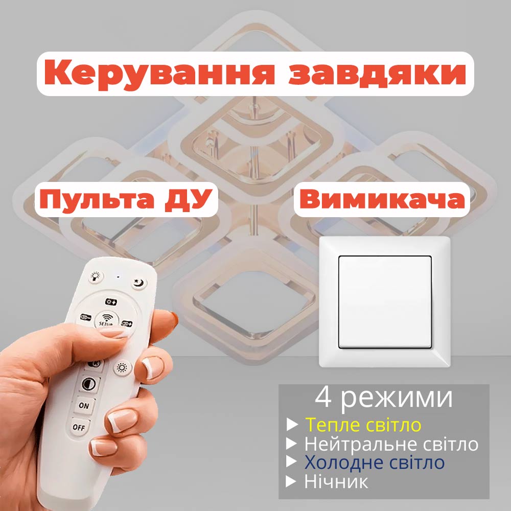 Немає відгуків про товар Люстра стельова світлодіодна Light House SL-18185/4+4C FG+RGB 144W DIMMER 3000-6000 H120*L450*W450, колір золото