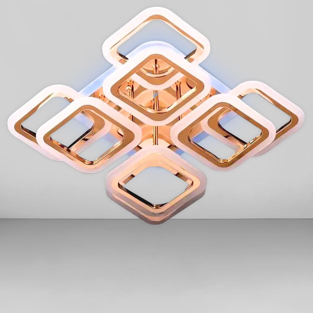 Люстра складається з вісім акрилових плафонів квадратної форми, що надають сучасності та елегантності у дизайні. Ця акрилова конструкція розсіює світло рівномірно та м'яко, забезпечуючи комфортне та затишне освітлення у приміщенні.