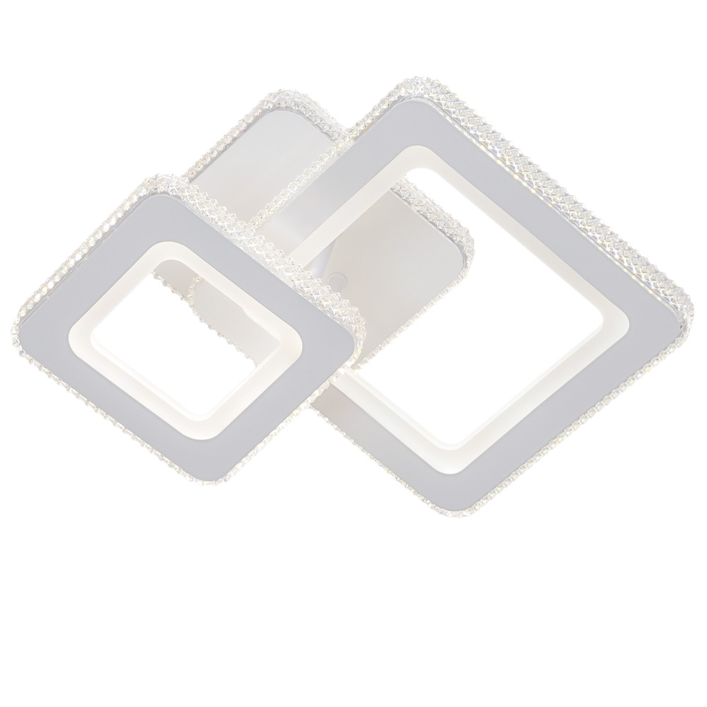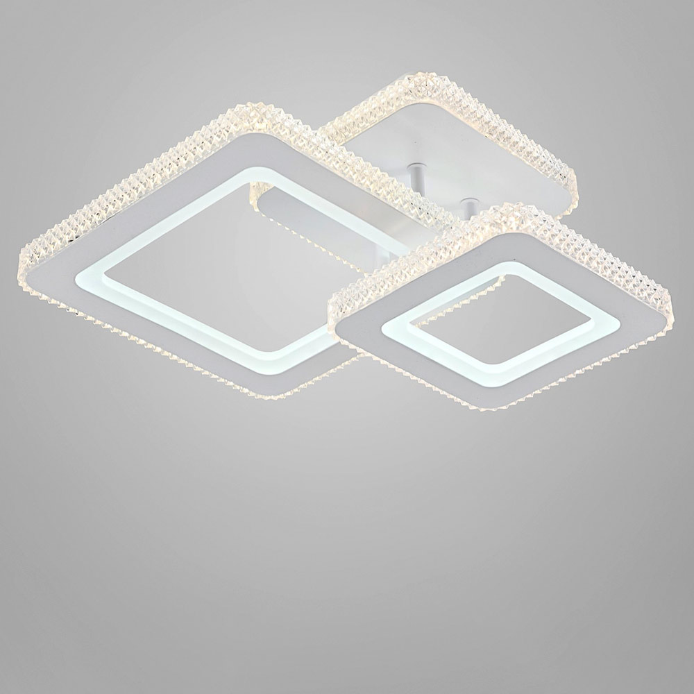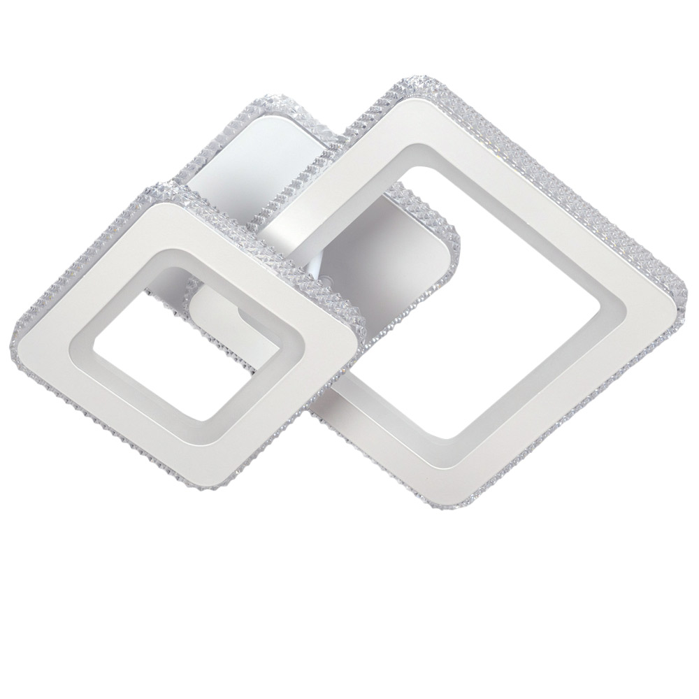 Сучасна стельова LED люстра на два джерела світла із вбудованими світлодіодами, оснащена функцією регулювання колірної температури та пультом управління. Незвичайний дизайн люстри складається з конструкції із 2 квадратних плафонів на квадратному металевому корпусі з LED підсвічуванням. Найкраще ця люстра підійде для освітлення 25 м² приміщення, відмінно підходить для невисоких стель.