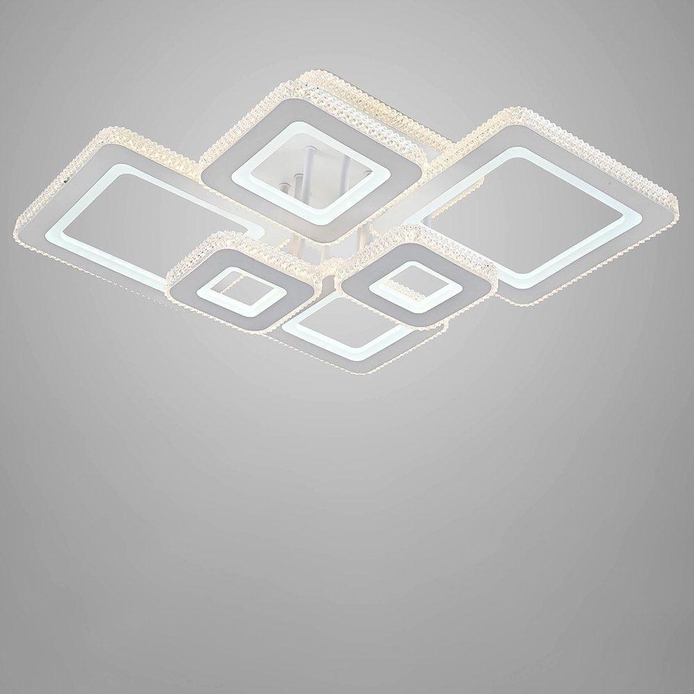 Сучасна стельова LED люстра на шість джерел світла із вбудованими світлодіодами, оснащена пультом керування з функцією регулювання яскравості та колірної температури. Незвичайний дизайн люстри складається з конструкції з шести квадратних плафонів на квадратному корпусі з LED підсвічуванням. Найкраще ця люстра підійде для освітлення великого приміщення.