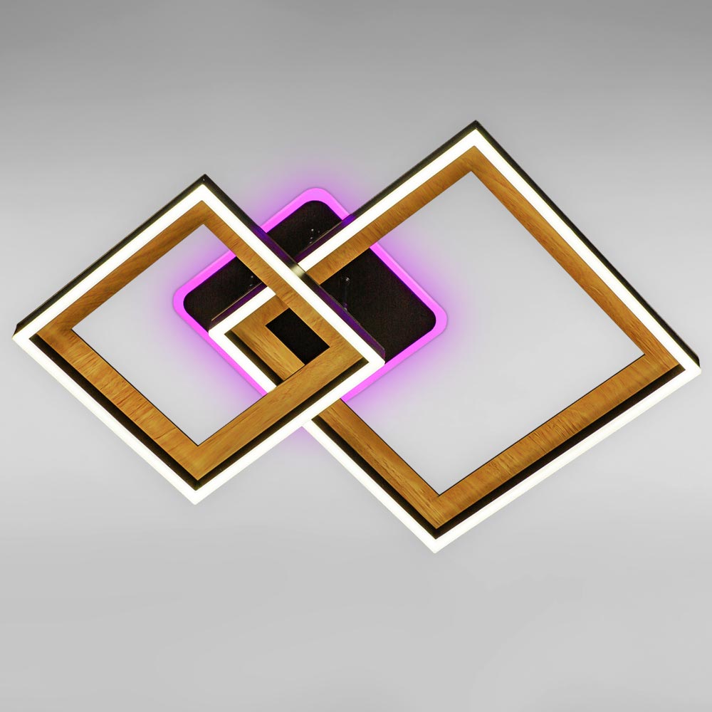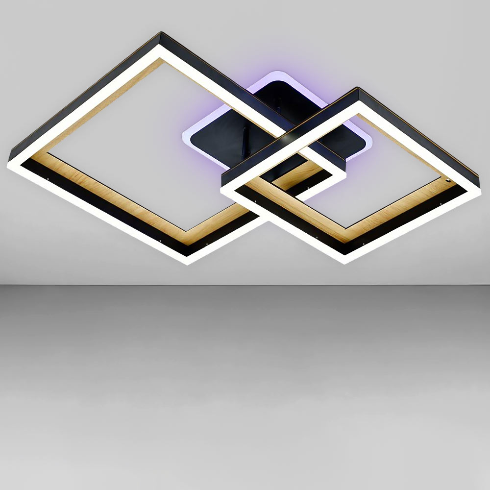 Сучасна стельова LED люстра на два джерела світла із вбудованими світлодіодами, оснащена пультом керування з функцією регулювання колірної температури. Незвичайний дизайн люстри включає в себе конструкцію з двох плафонів у вигляді світлодіодних квадратів з імітацією дерева на квадратному корпусі з LED підсвічуванням. Найкраще ця люстра підійде для освітлення 28 м² приміщення, відмінно підходить для невисоких стель.