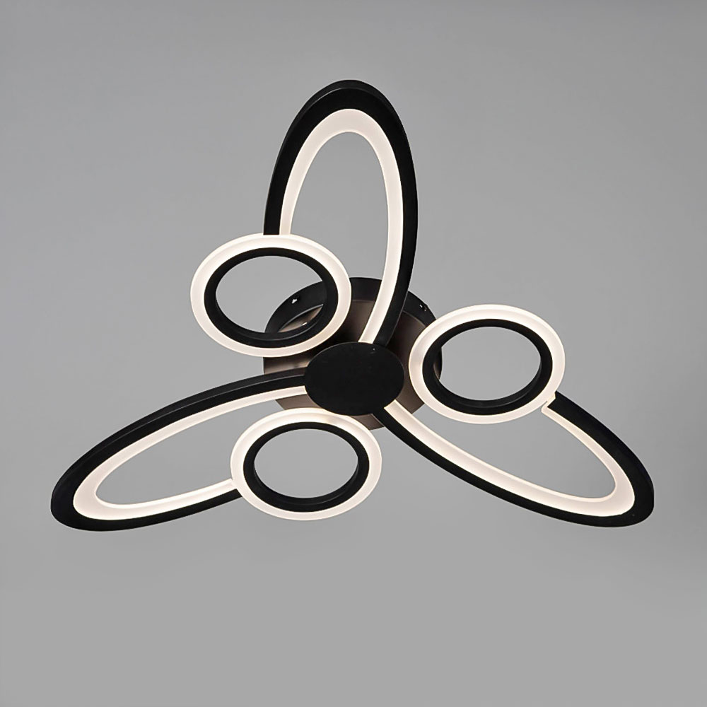 Сучасна стельова LED люстра на шість джерел світла з вбудованими світлодіодами, оснащена пультом керування з функцією регулювання колірної температури. Незвичайний дизайн люстри включає конструкцію з шести плафонів у вигляді кілець і неповних овалів на круглому корпусі. Найкраще ця люстра підійде для освітлення 24 м² приміщення, відмінно підходить для невисоких стель.
