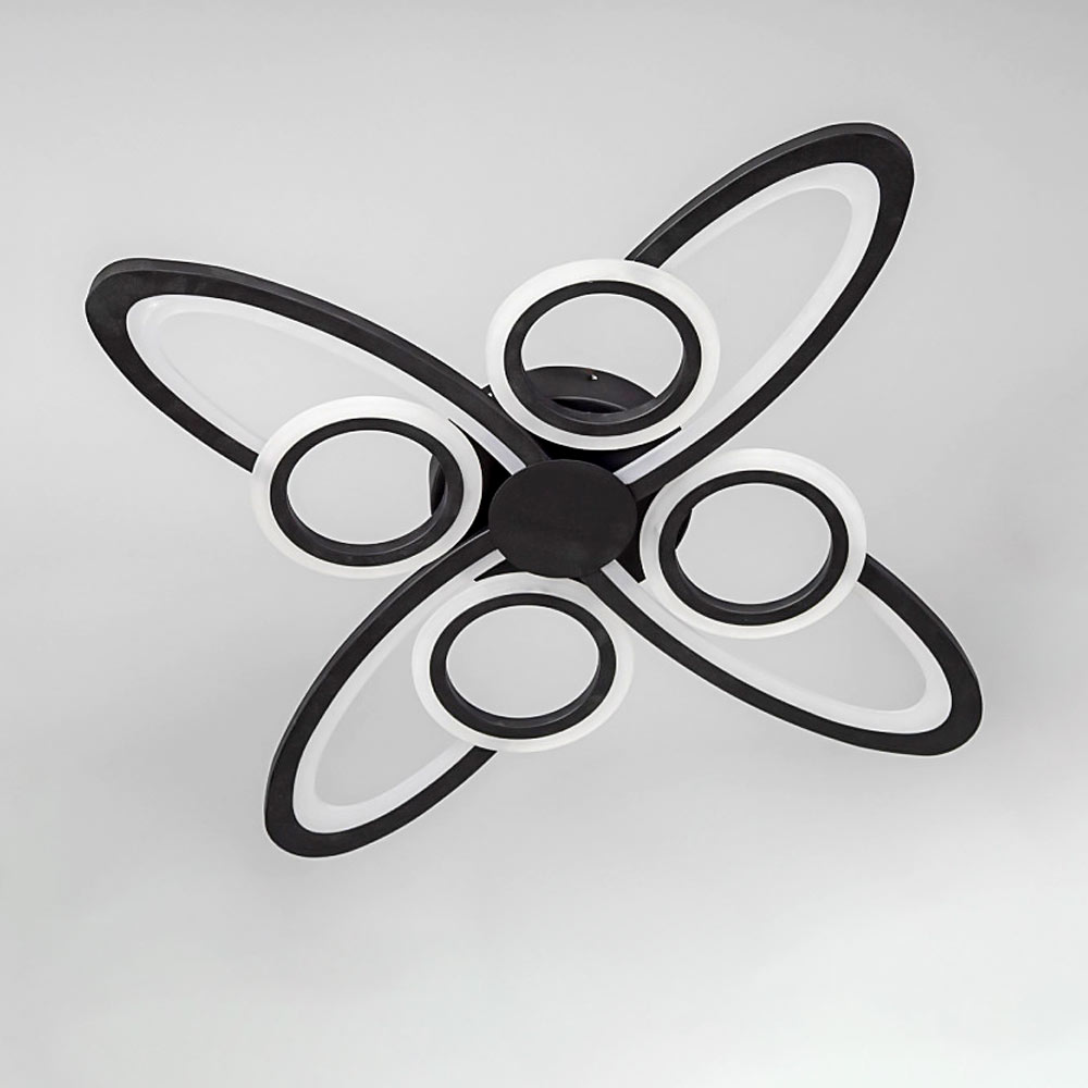 Сучасна стельова LED люстра на вісім джерел світла із вбудованими світлодіодами, оснащена пультом керування з функцією регулювання колірної температури. Незвичайний дизайн люстри включає конструкцію з восьми плафонів у вигляді кілець і неповних овалів на круглому корпусі. Найкраще ця люстра підійде для освітлення 32 м² приміщення, відмінно підходить для невисоких стель.