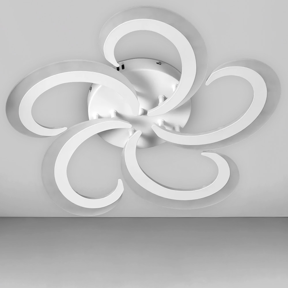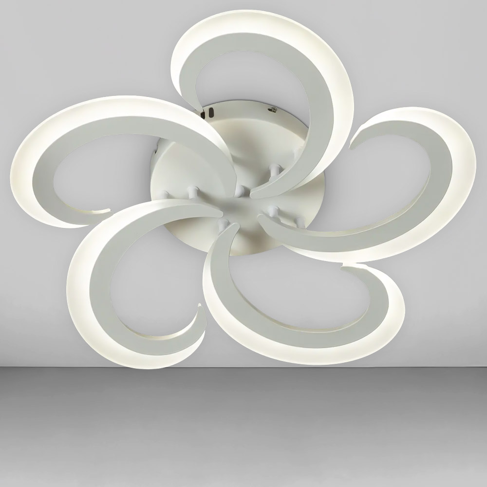 Сучасна стельова LED люстра на п'ять джерел світла із вбудованими світлодіодами, оснащена пультом керування з функцією регулювання колірної температури. Незвичайний дизайн люстри включає в себе конструкцію з п'яти плафонів гачкоподібної форми на круглому корпусі: що нагадує квітку. Найкраще ця люстра підійде для освітлення 17 м² приміщення, відмінно підходить для невисоких стель.