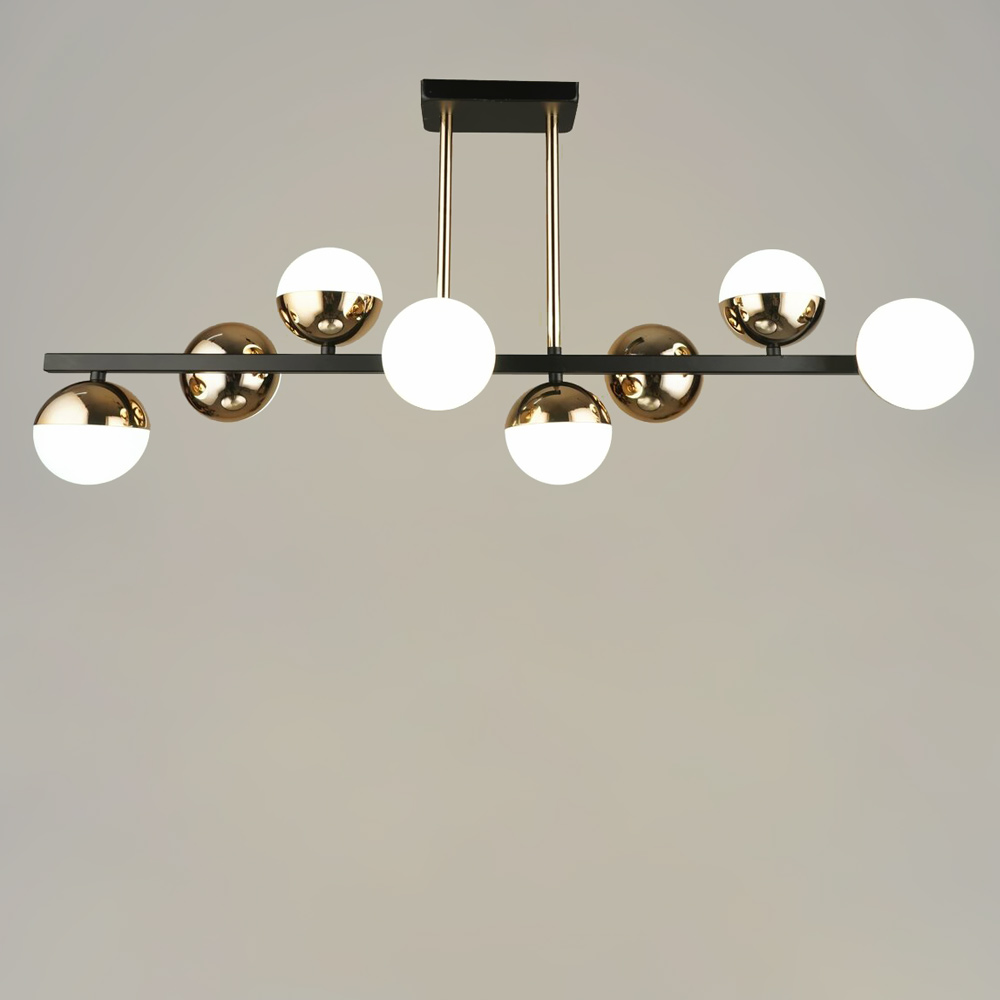 Каркас виготовлений із міцного металу чорного та позолоченого кольору, що надає люстру сучасного та стильного вигляду. Вісім круглих плафонів поступово розподіляють світло, створюючи комфортну атмосферу.