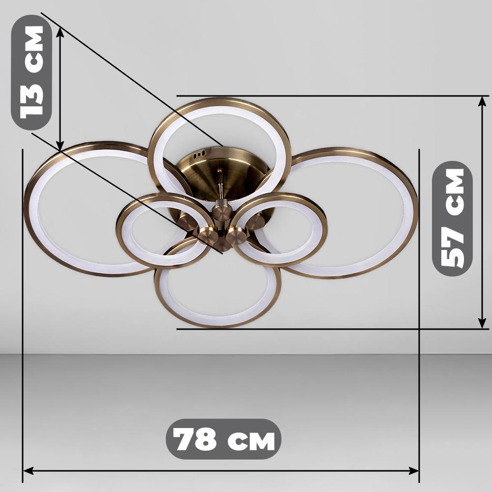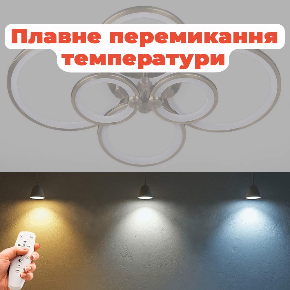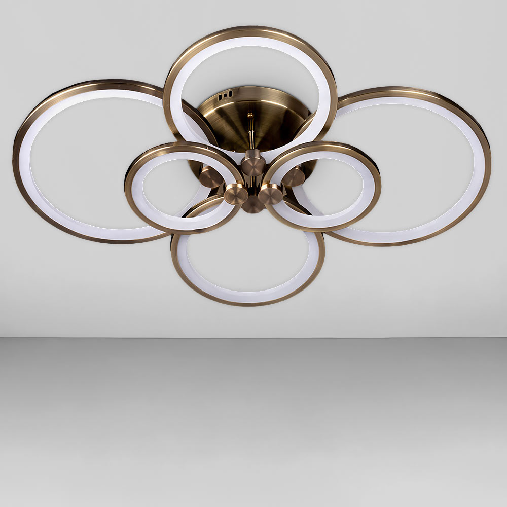 Стельова світлодіодна люстра в сучасному стилі, на шість джерел світла у вигляді LED кілець з диммером.