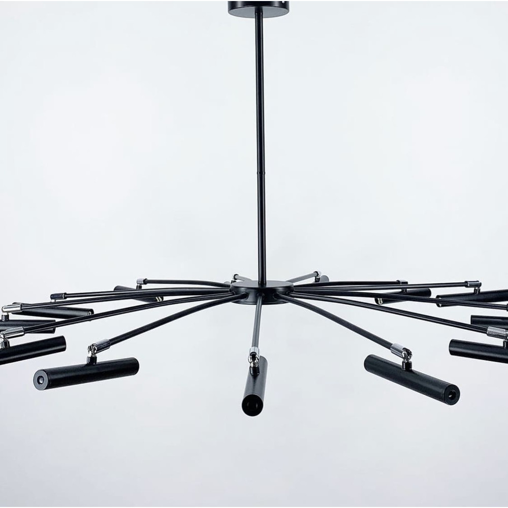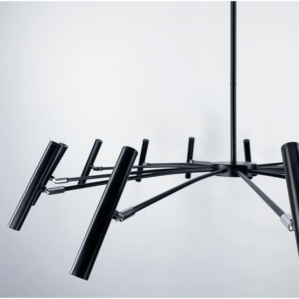 Стельова люстра-павук на дев'ять ламп з поворотними плафонами циліндричної форми. Найкраще ця люстра підійде для приміщень із загальною площею 27 м², при використанні лампочки 6 Вт. Висота регулюється, що дозволяє адаптувати люстру під різні простори та потреби.