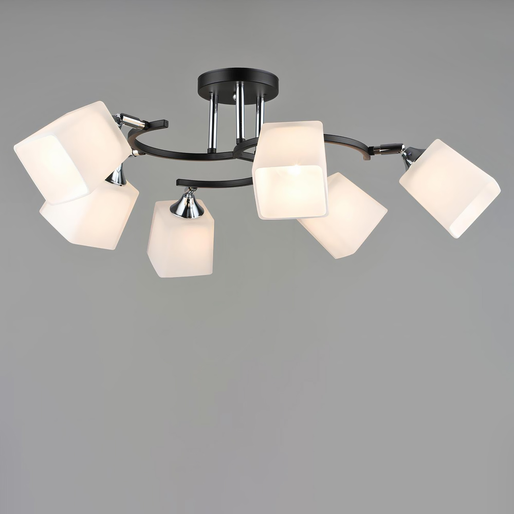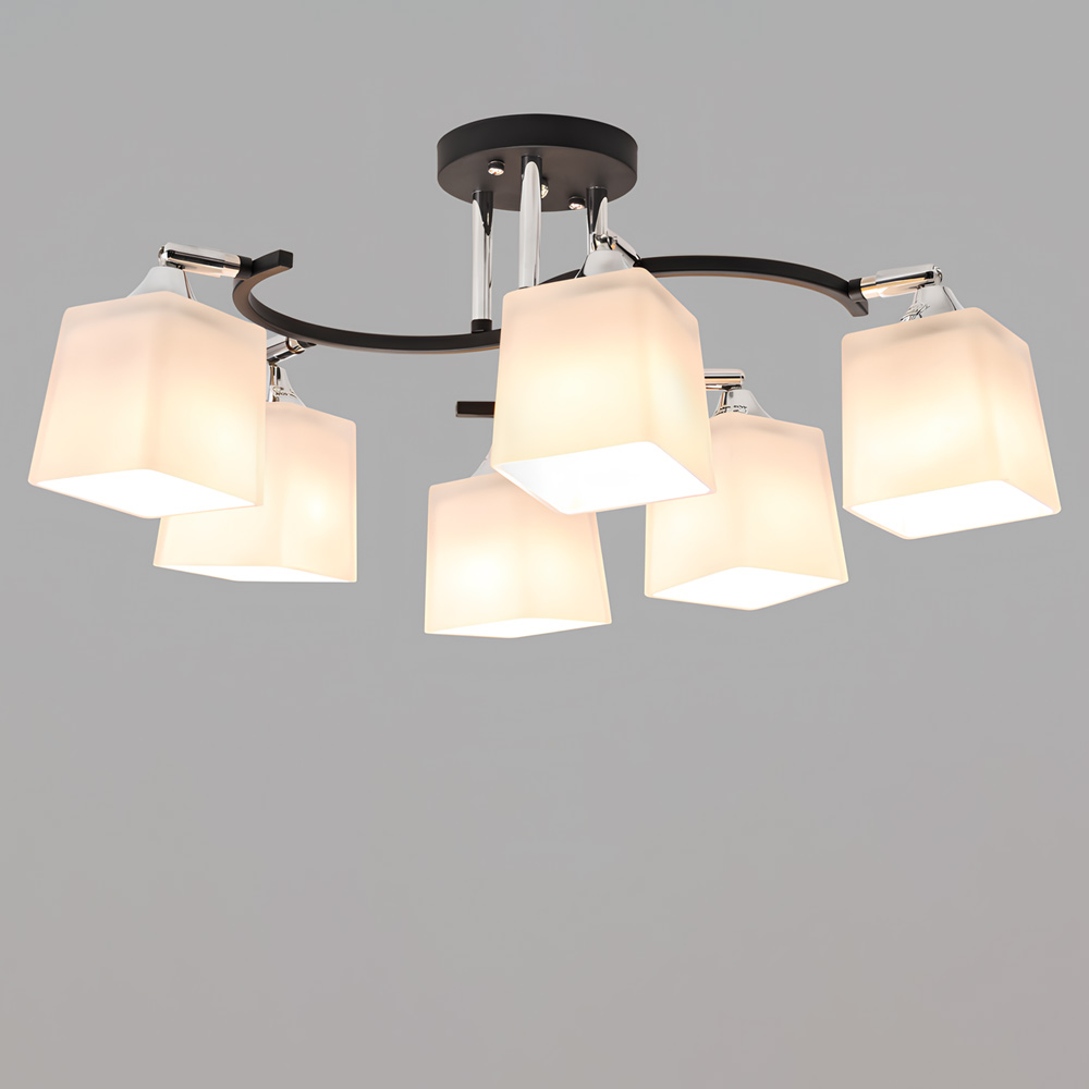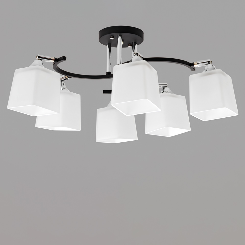 Стельова люстра на шість ламп зі скляними плафонами з поворотним механізмом. Плафони білі матові, мають прямокутну форму. У поєднанні чорного матового металу та блиску хрому ідеально впишеться у сучасні інтер'єри.