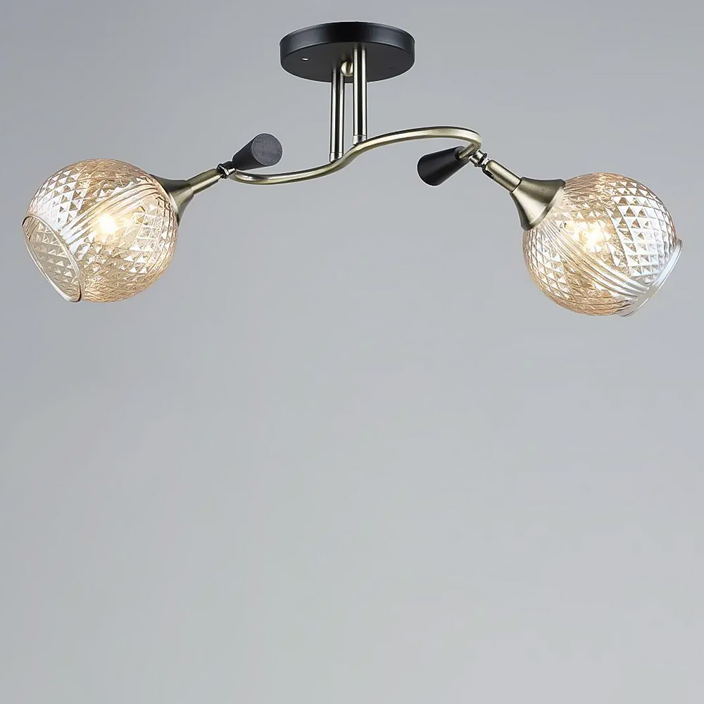 Стельова люстра на дві лампи зі скляними рифленими плафонами круглої форми з поворотним механізмом.