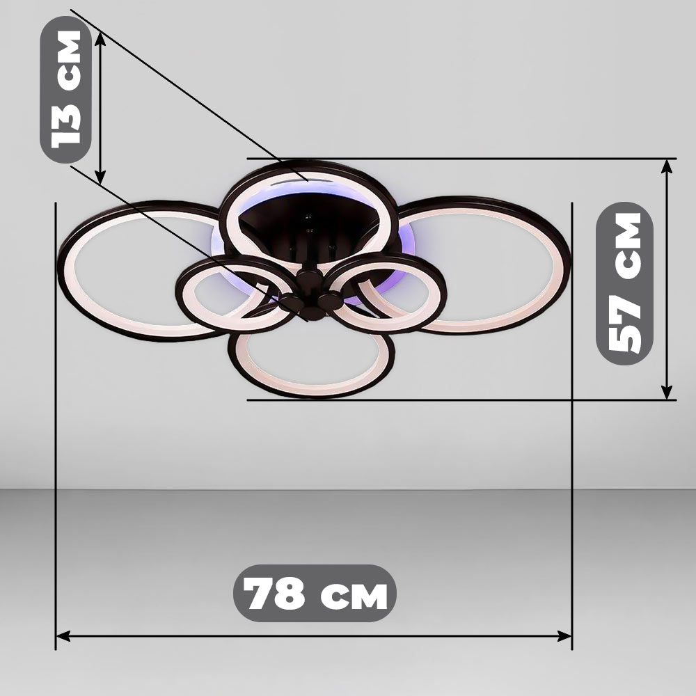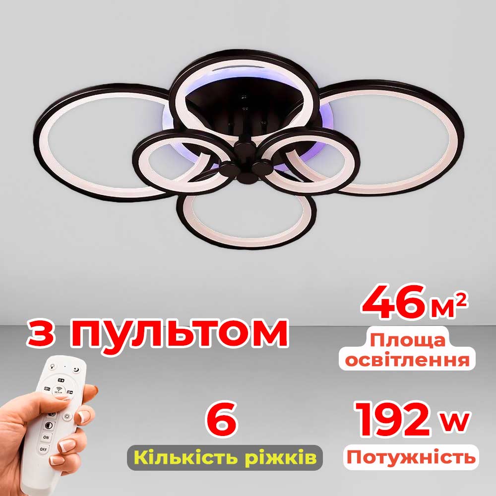 Стельова світлодіодна люстра у сучасному стилі, на шість джерел світла у вигляді LED кілець з диммером та RGB з підсвічуванням корпусу.