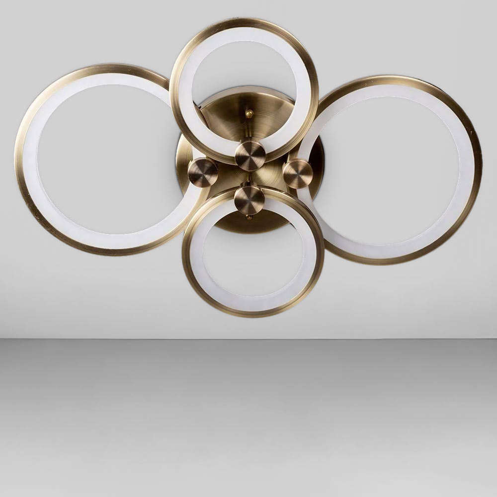 Люстра складається з чотирьох плафонів у вигляді LED кілець, що надають сучасності та елегантності у дизайні. Ця конструкція розсіює світло рівномірно та м'яко, забезпечуючи комфортне та затишне освітлення у приміщенні.