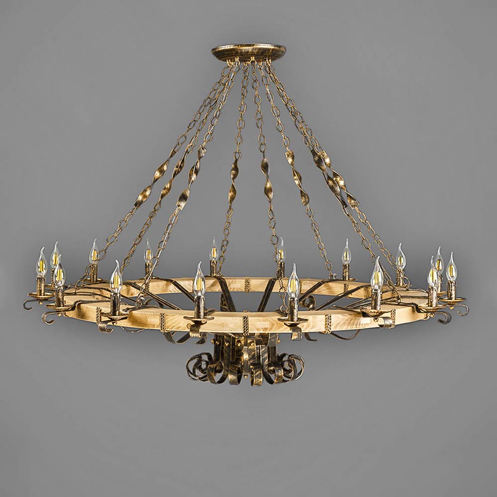 Підвісна декоративна люстра на 16 лампах свічки без плафонів на дерев'яному корпусі у вигляді кільця.