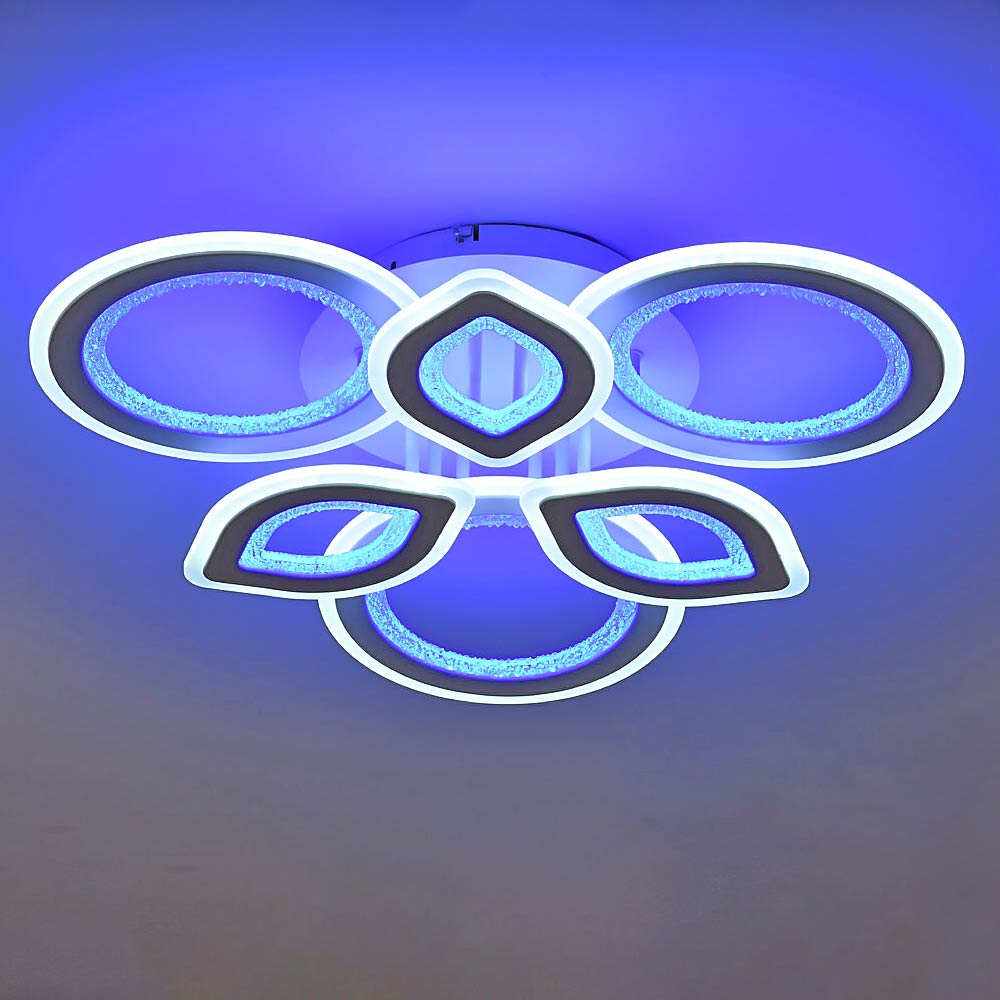 Діапазон колірної температури від 3000 до 6500К дозволяє створювати різні атмосфери у приміщенні, від затишного тепла до більшої яскравості. Люстра оснащена RGB-підсвічуванням, що дозволяє експериментувати зі світловими ефектами та кольорами.